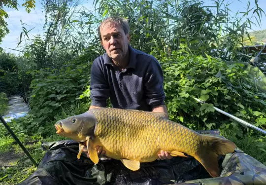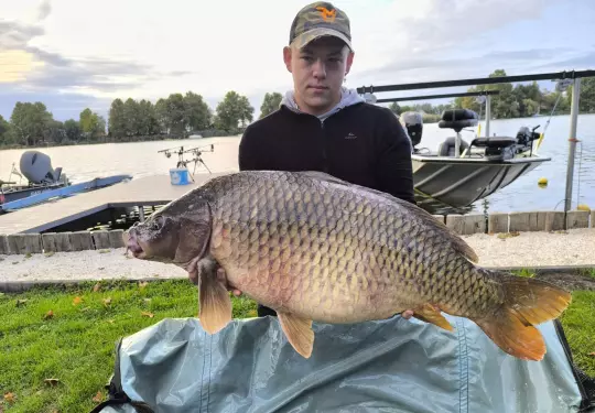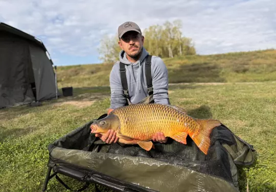 3,9 m-es 3,5 lbs bot, 0,30-as monofil zsinór, 4-es horog. Bojli csali és etetés. Hűvös idő, szélcsend, 5 perces fárasztás partról.