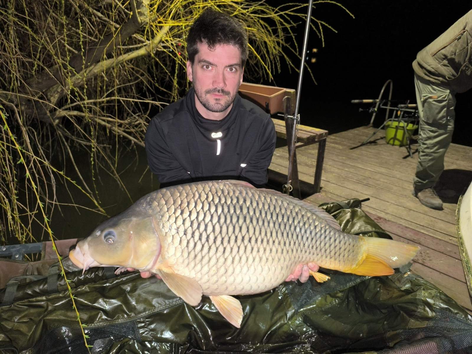 3 m-es 3,5 lbs bot, 0,35-ös monofil zsinór, 4-es horog. Bojli csali és etetés. Hideg idő, szélcsend, 20 perces fárasztás partról.