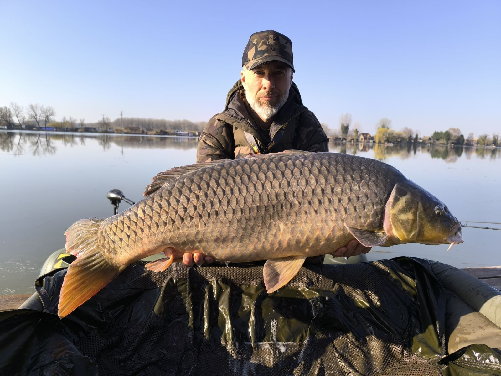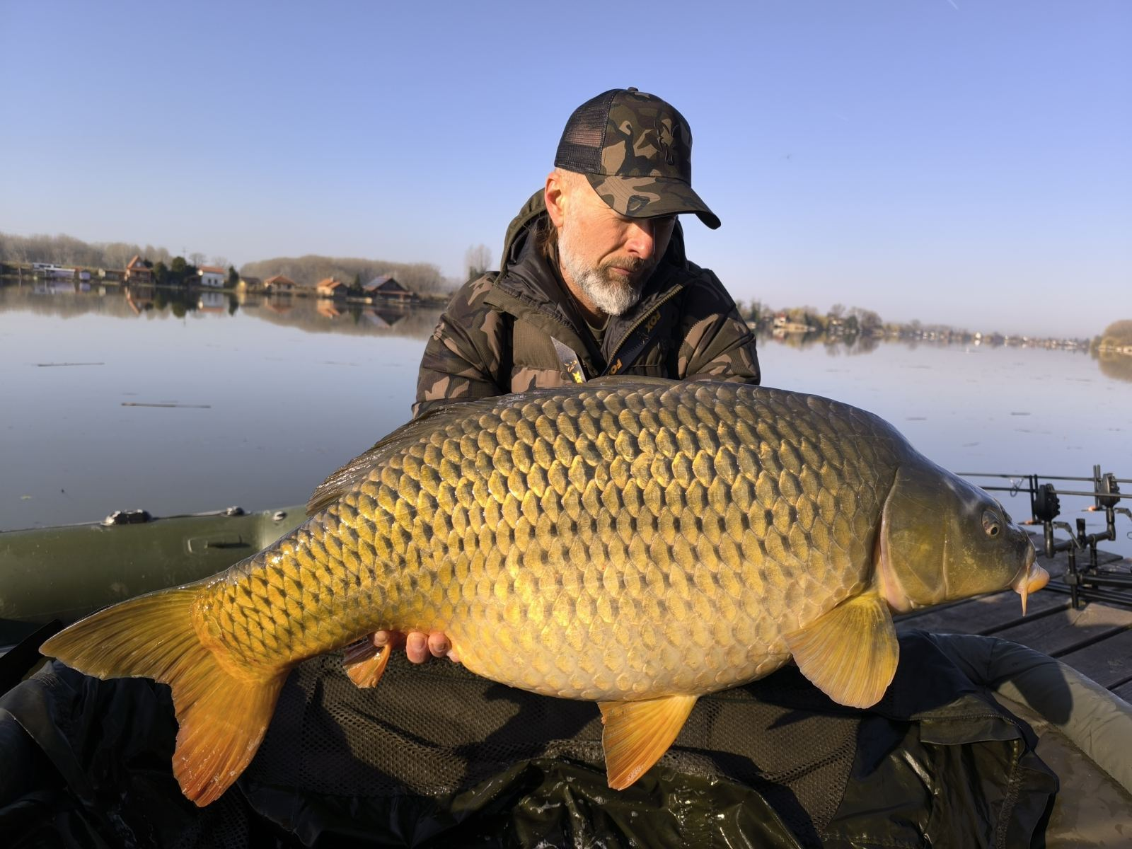 3 m-es 3,0 lbs bot, 0,35-ös monofil zsinór, 6-os horog. Bojli csali és etetés. Hideg idő, szélcsend, 15 perces fárasztás csónakból.