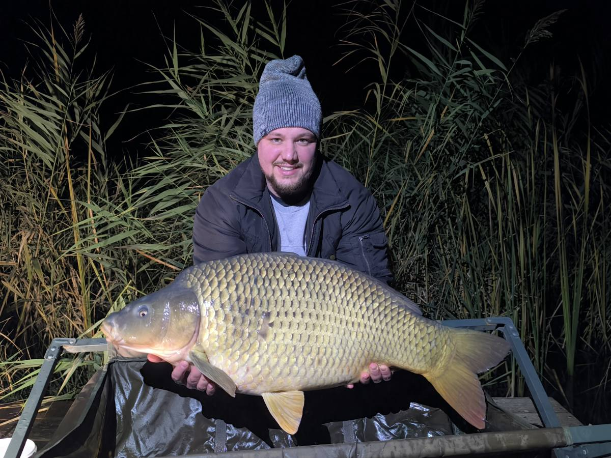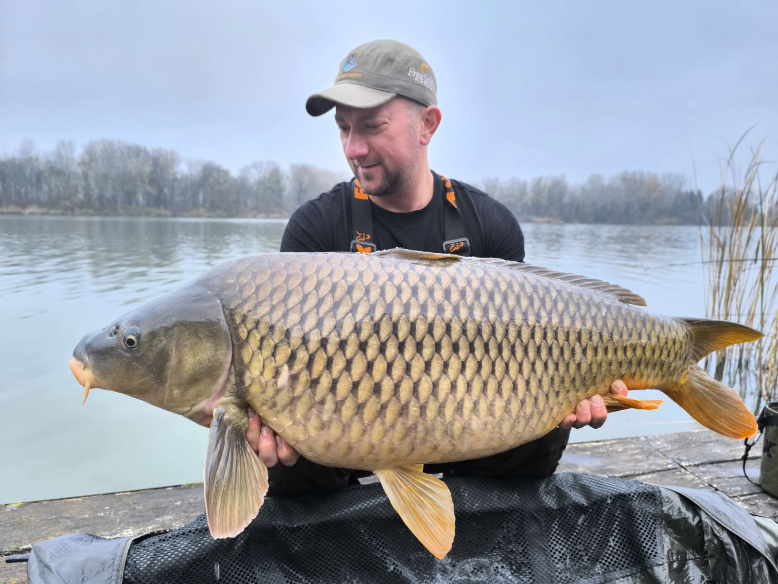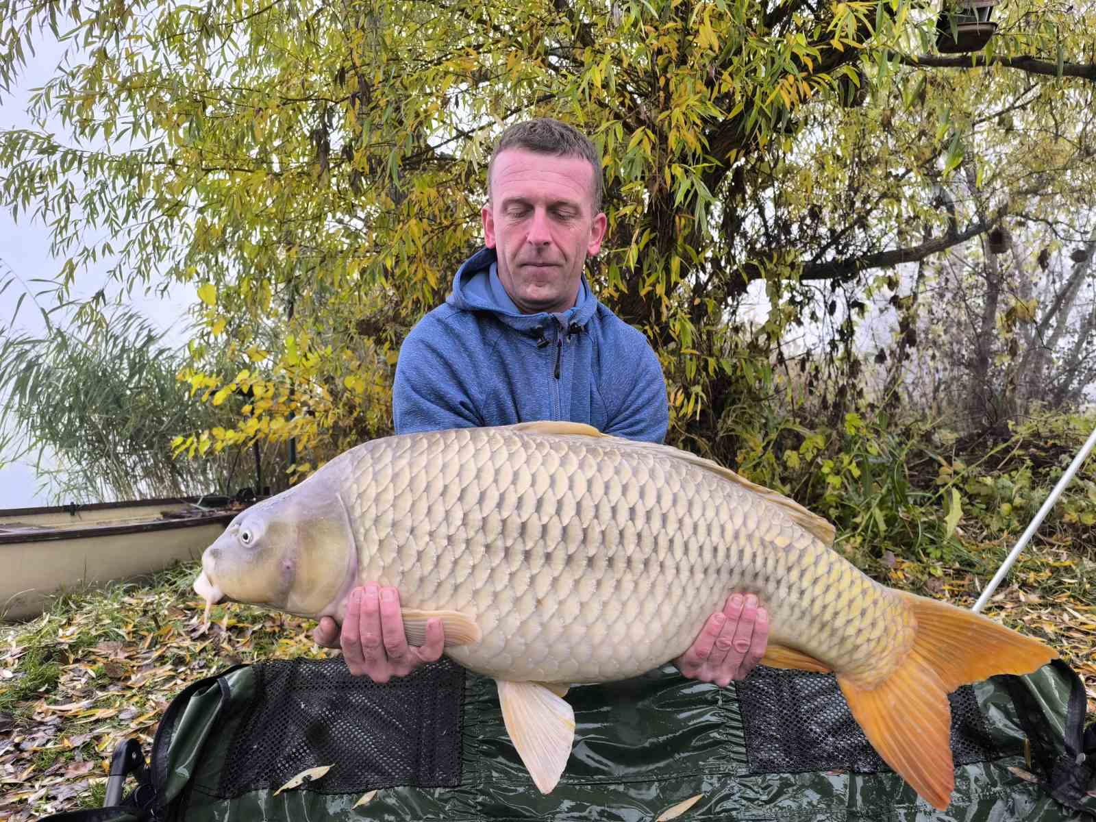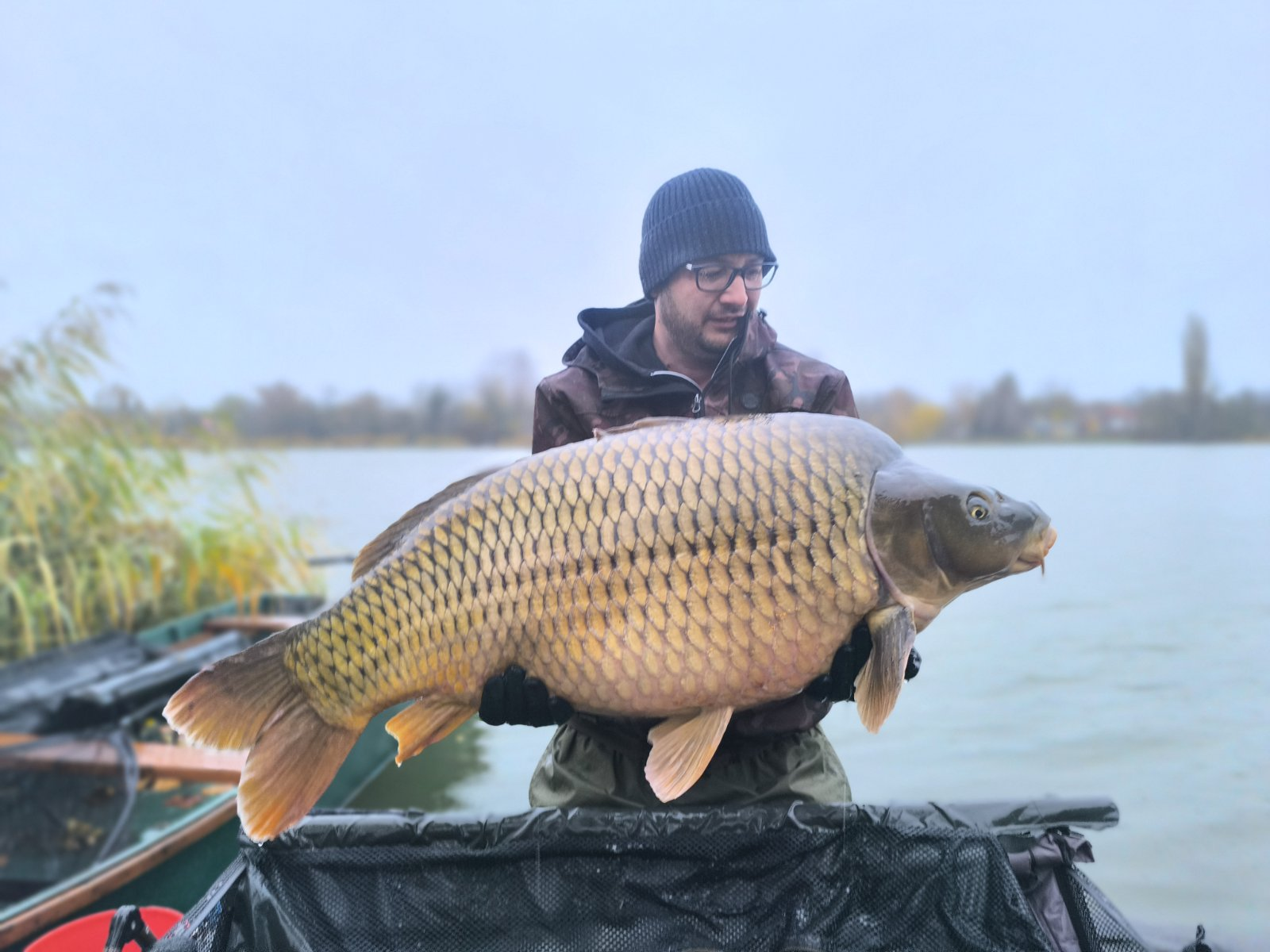 3,3 m-es 2,5 lbs bot, 0,33-as monofil zsinór, 6-os horog. Bojli csali és etetés. Ködös, enyhe idő, 20 perces fárasztás csónakból.