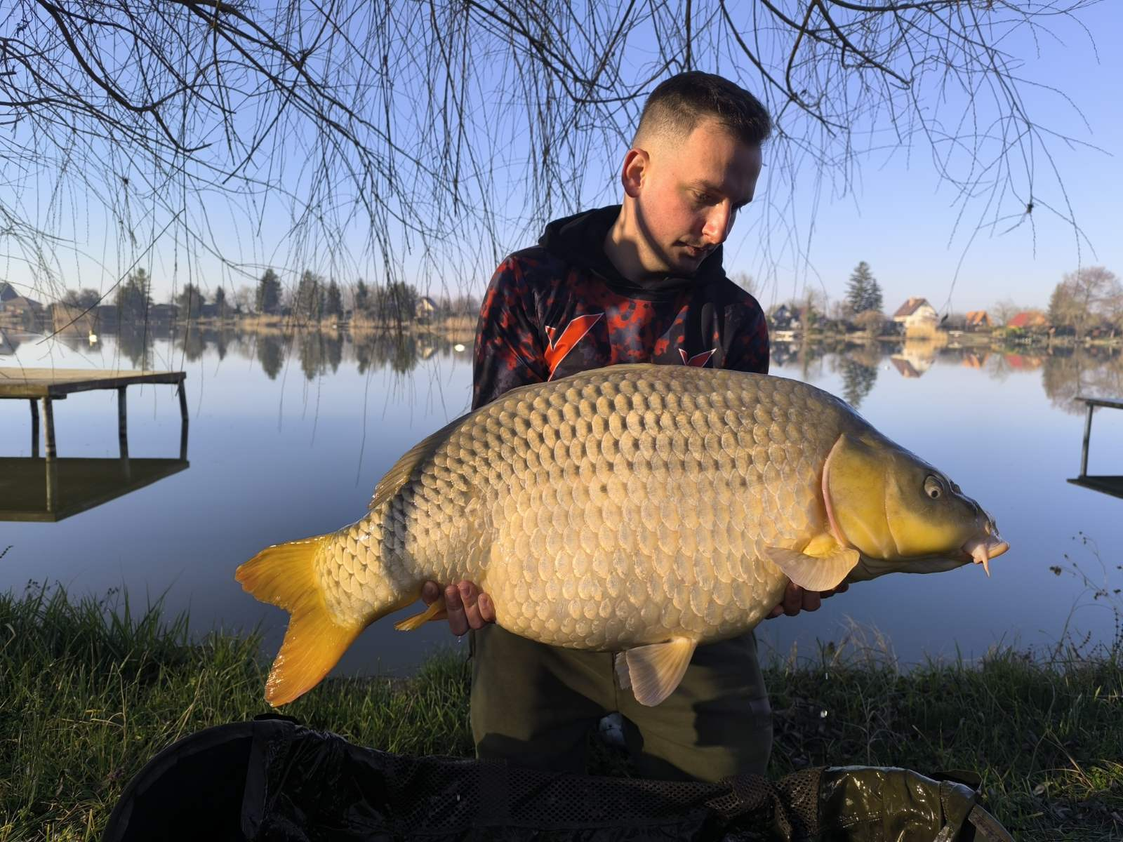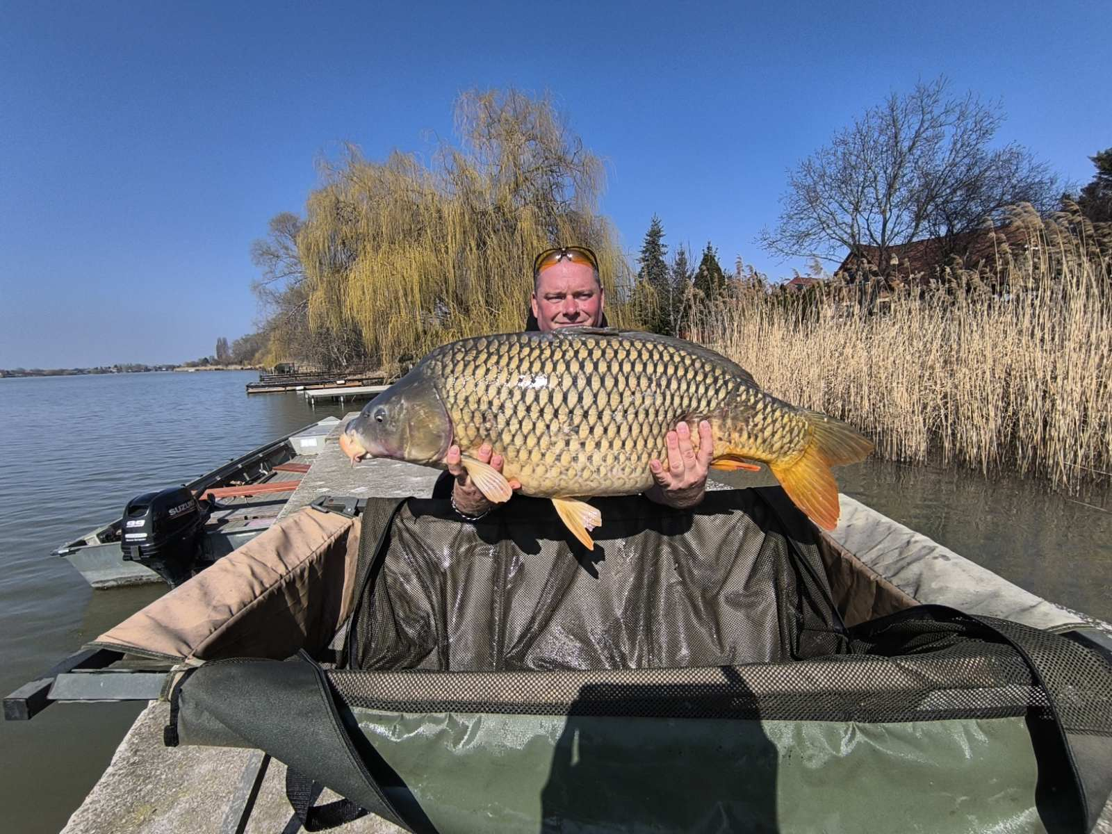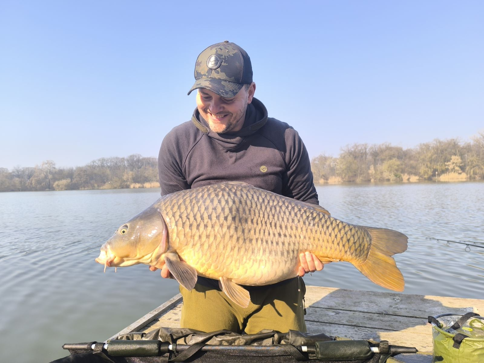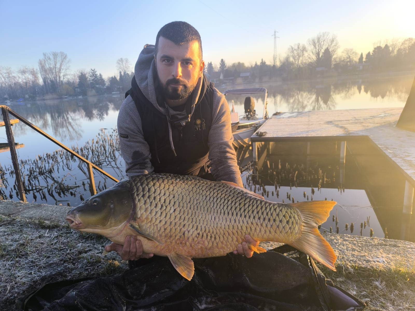 3,9 m-es 3,5 lbs bot, 2-es horog. Bojli csali és etetés. Napos idő, szélcsend, 15 perces fárasztás partról.