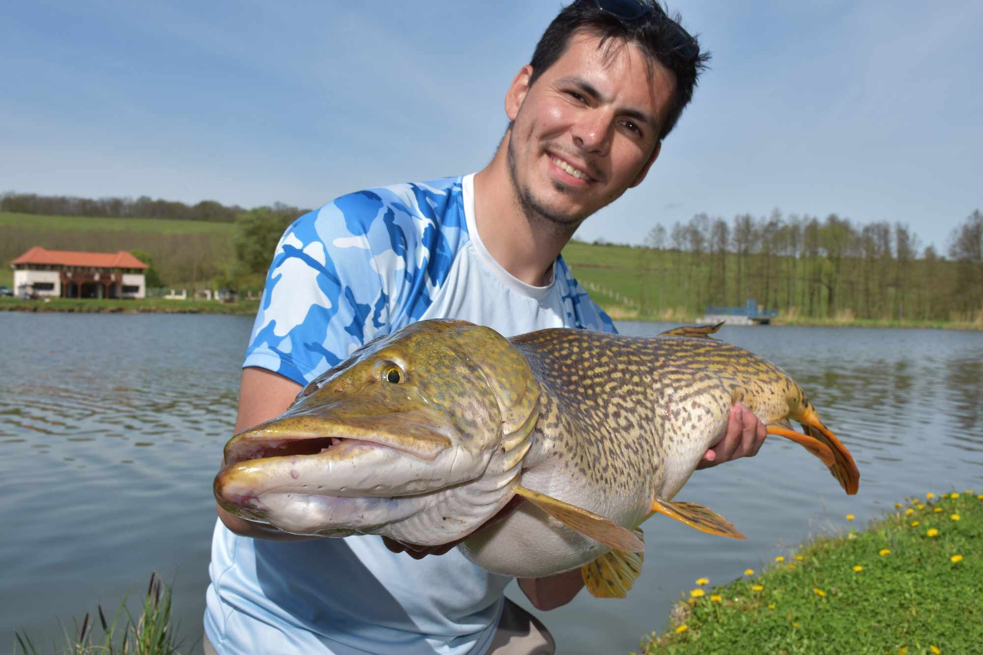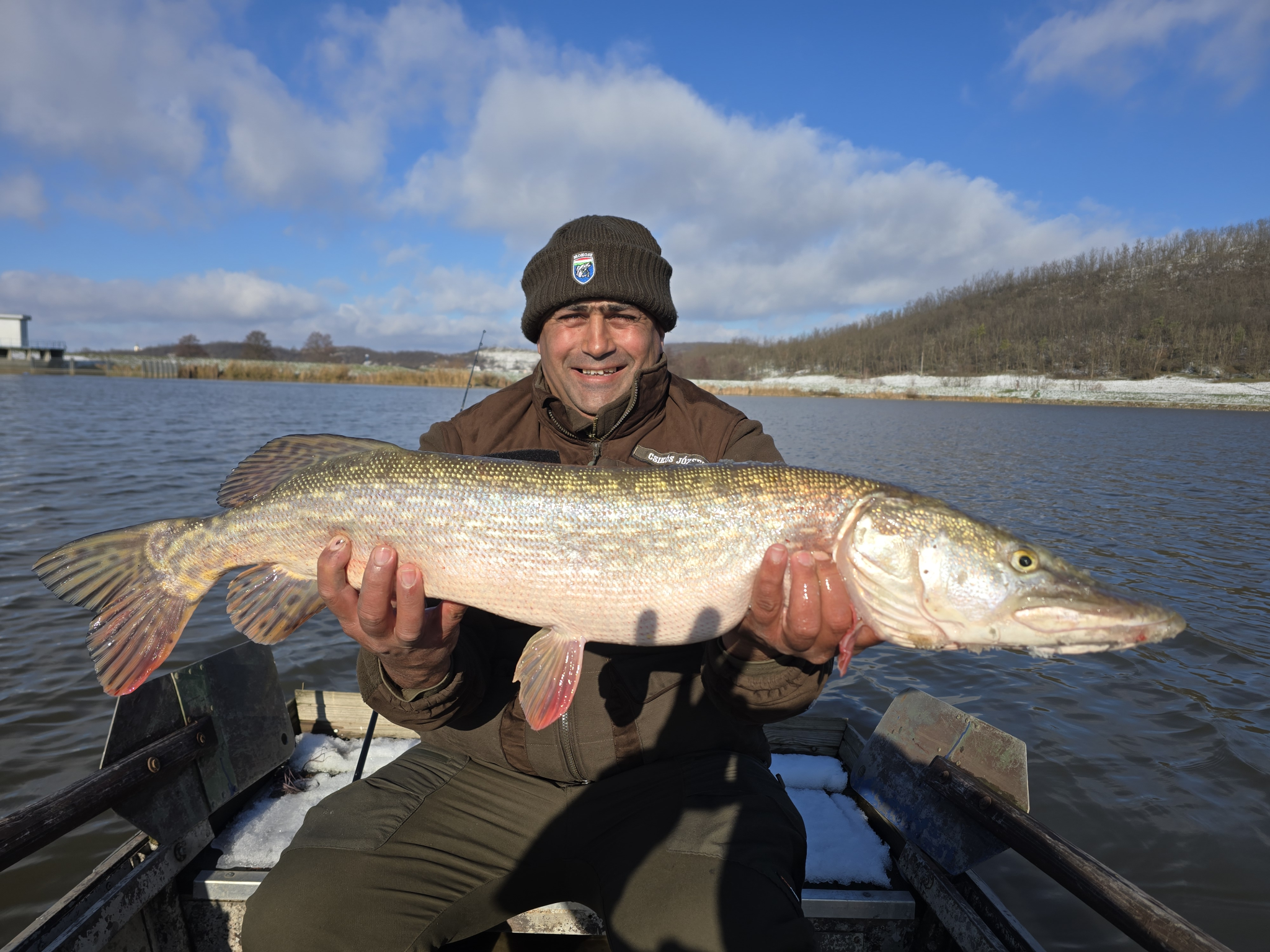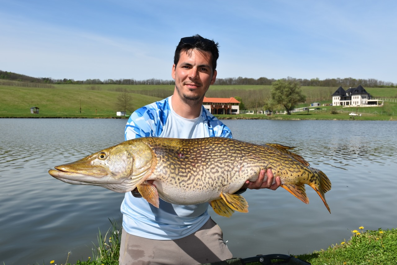 Párás, hűvös időben folyamatos felszíni rablások voltak láthatóak a vízen. Először egy kisebb, 1 kg körüli balint sikerült zsákmányolni egy 7 cm-es Salmo Minnow woblerrel, majd egy Fox Rage Big Eye Spin Tail vízközti vezetése alkalmával, határozott, kemény rávágással jelentkezett a képen látható ragadozó őn. Egy kb. 3 perces fárasztás végén szákolta meg kisfiam. Rövid fényképezést követően visszaengedtük a Lázbérci víztározóba.