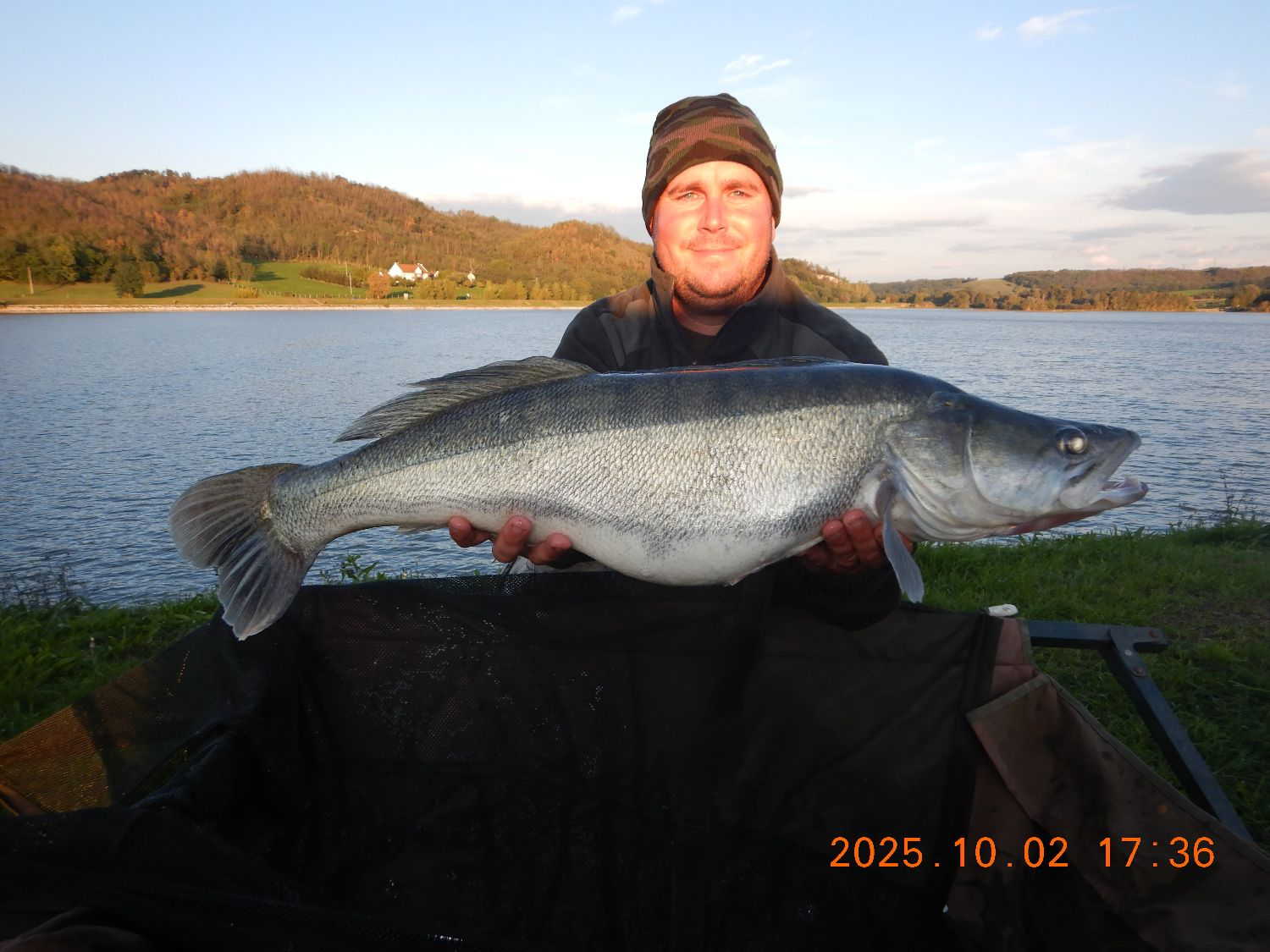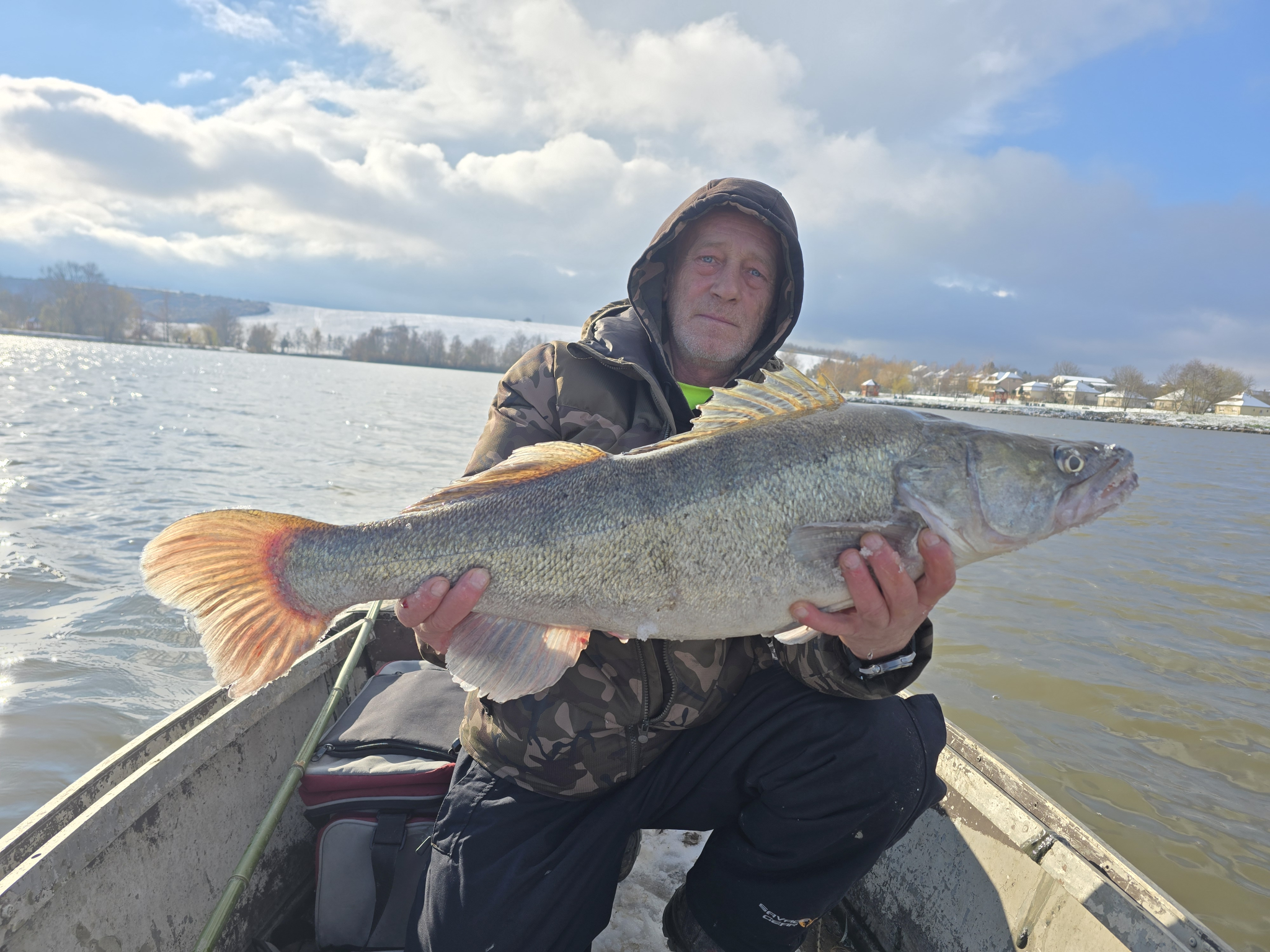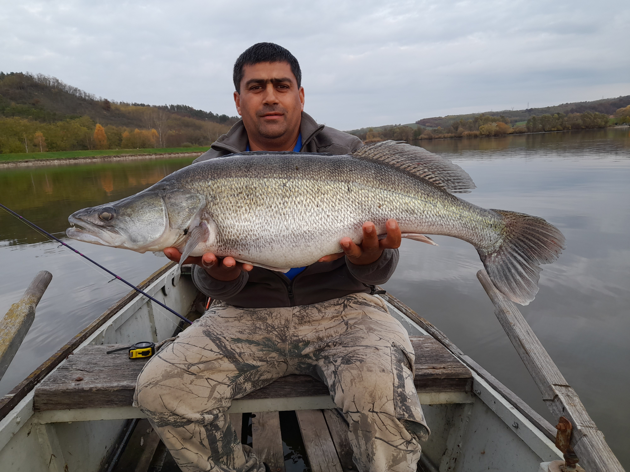 Párás, hűvös időben folyamatos felszíni rablások voltak láthatóak a vízen. Először egy kisebb, 1 kg körüli balint sikerült zsákmányolni egy 7 cm-es Salmo Minnow woblerrel, majd egy Fox Rage Big Eye Spin Tail vízközti vezetése alkalmával, határozott, kemény rávágással jelentkezett a képen látható ragadozó őn. Egy kb. 3 perces fárasztás végén szákolta meg kisfiam. Rövid fényképezést követően visszaengedtük a Lázbérci víztározóba.