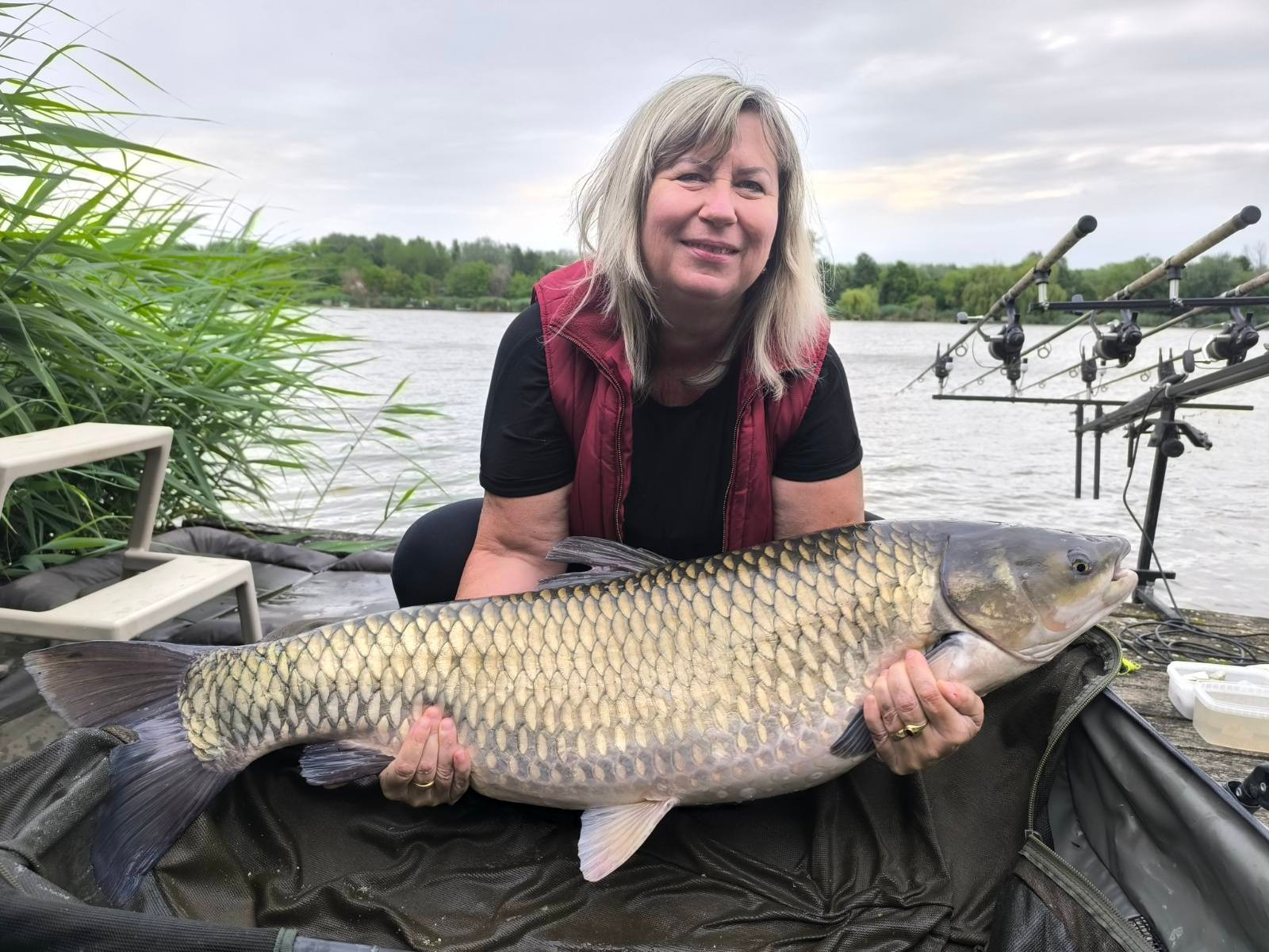 3 m-es 2,0 lbs bot, 0,35-ös monofil zsinór, 4-es horog. Tigrismogyoró csali és etetés. Napos idő, 20 perces fárasztás csónakból.