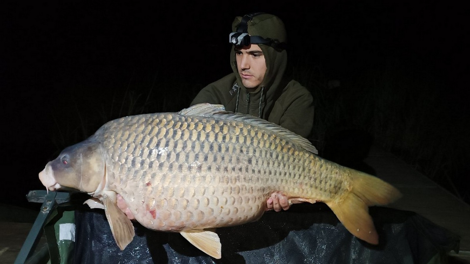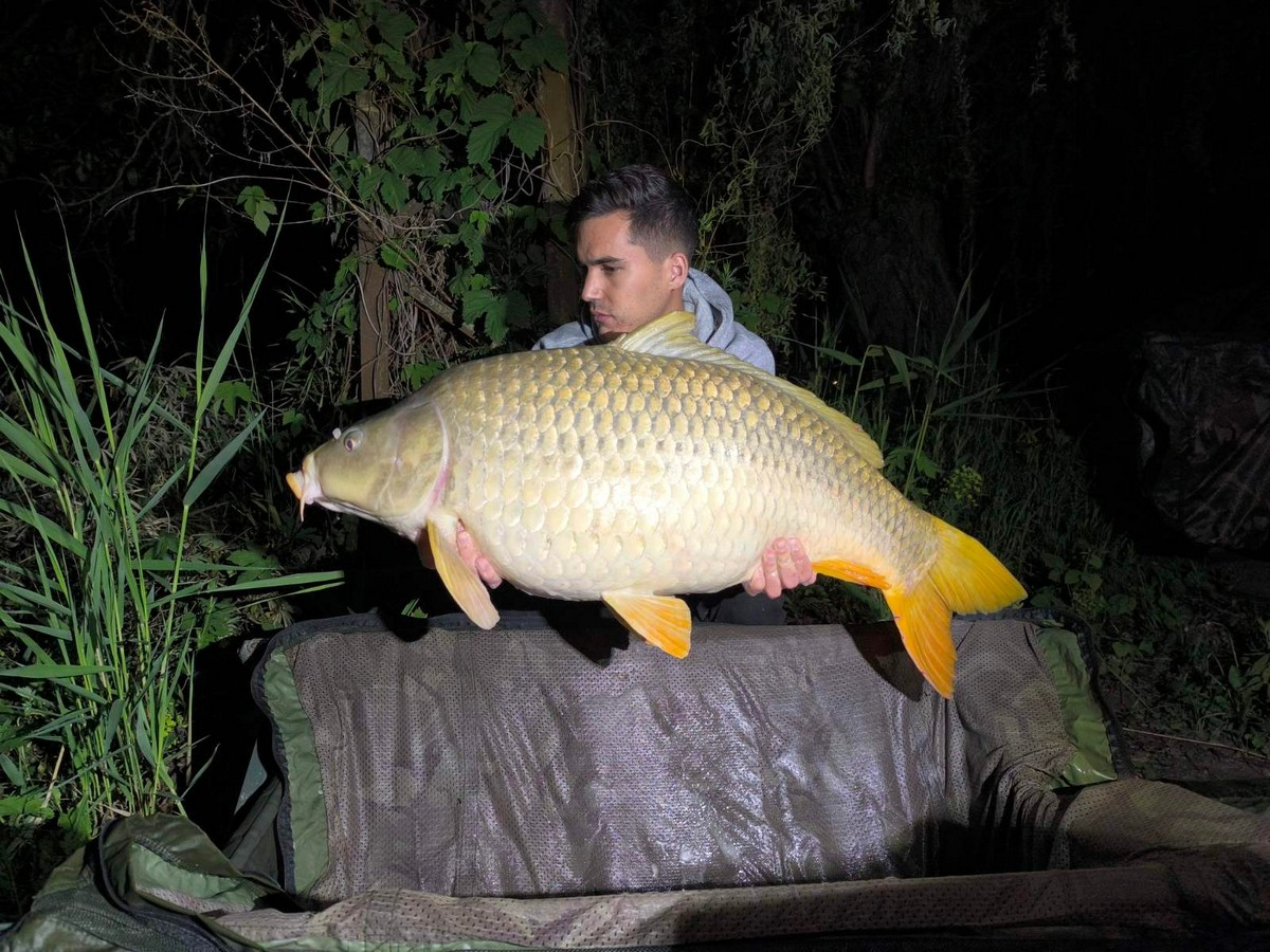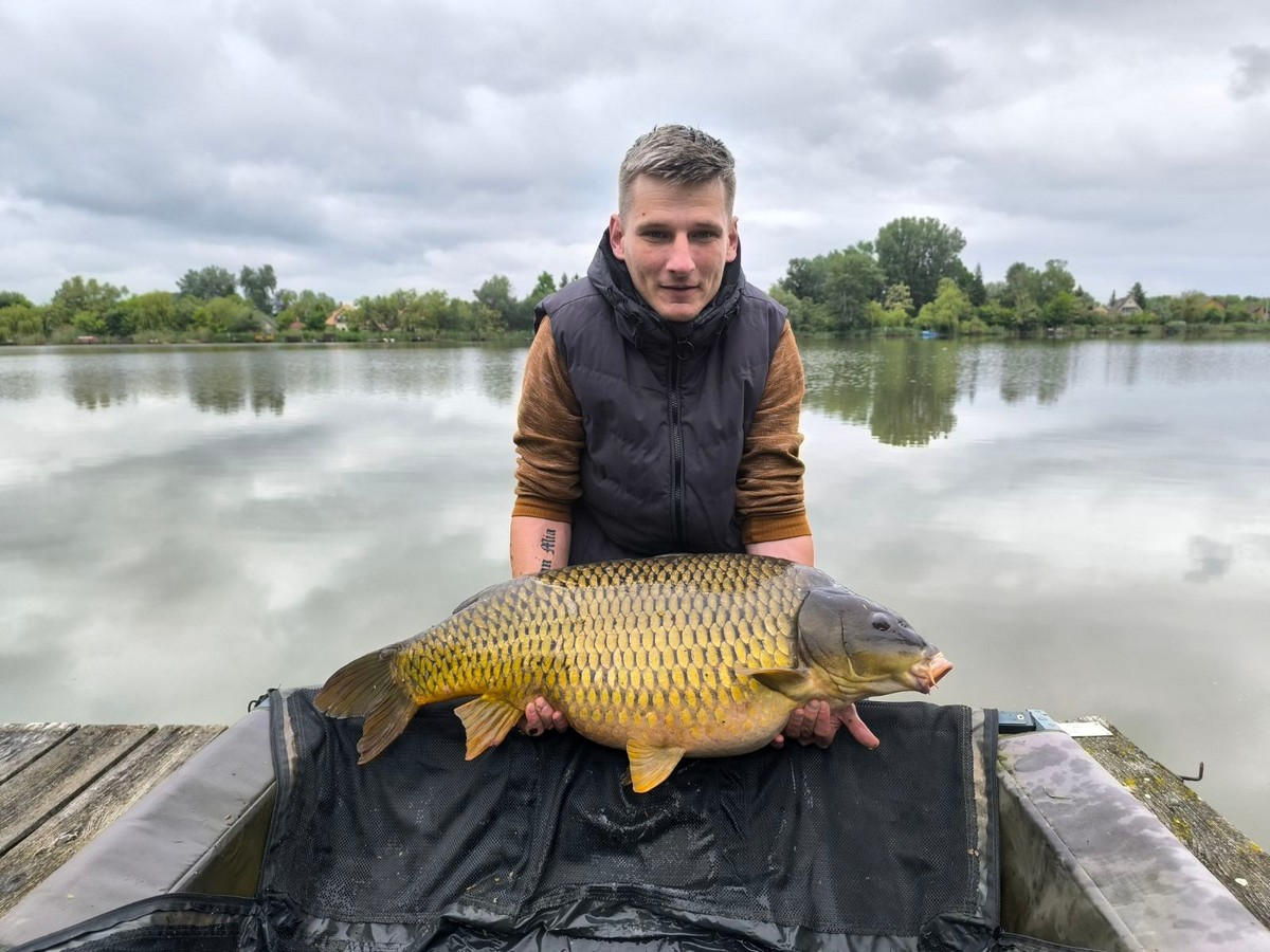 3,6 m-es 2,75 lbs bot, 0.35-ös monofil zsinór, 4-es horog. Tigrismogyoró csali és etetés. Borús idő, szélcsend, 15 perces fárasztás partról.