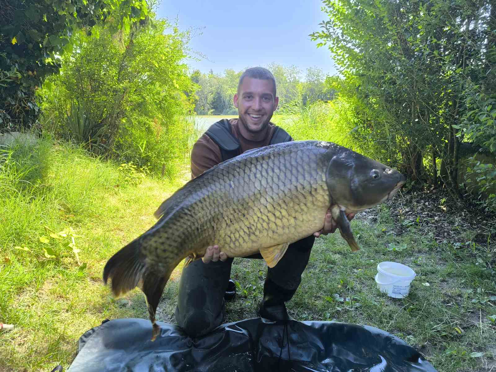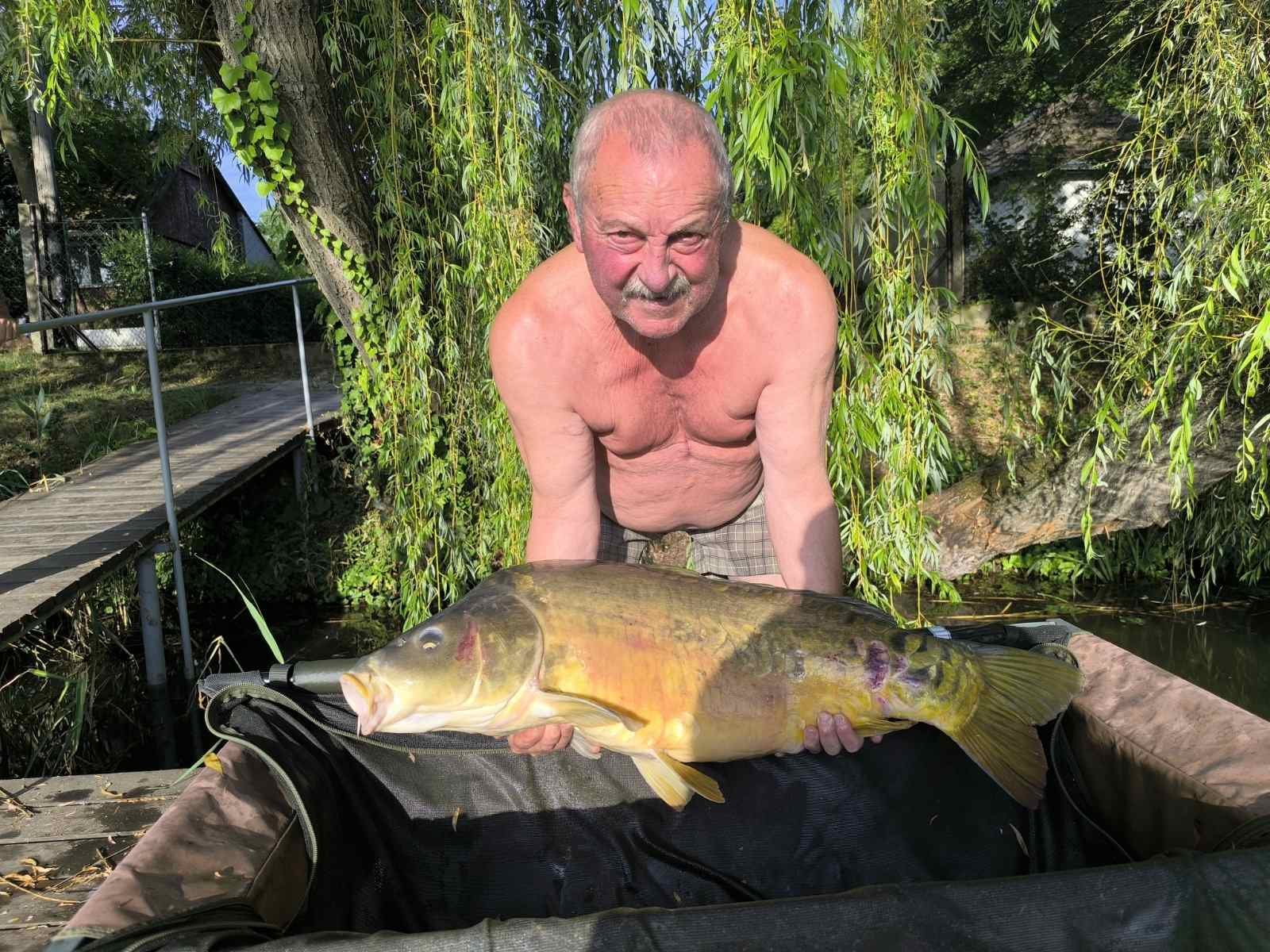 3,6 m-es 3,0 lbs bot, 0,28-as monofil zsinór, 6-os horog. Kukorica csali, etetés bojlival. Derült idő, szélcsend, 30 perces fárasztás partról.