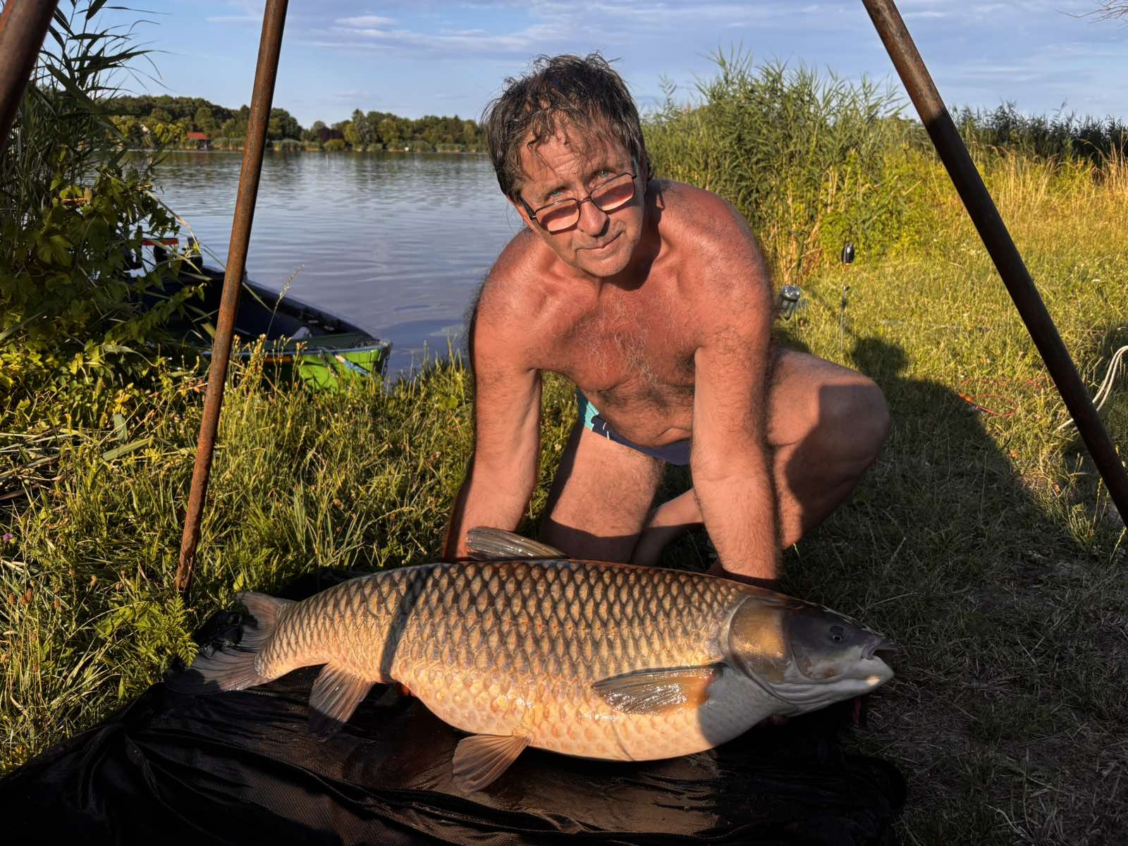 3,9 m-es 150 grammos bot, 0,22-es monofil zsinór, 4-es horog. Kukorica csali, etetés bojlival. Derűs idő, szélcsend, 15 perces fárasztás csónakból.