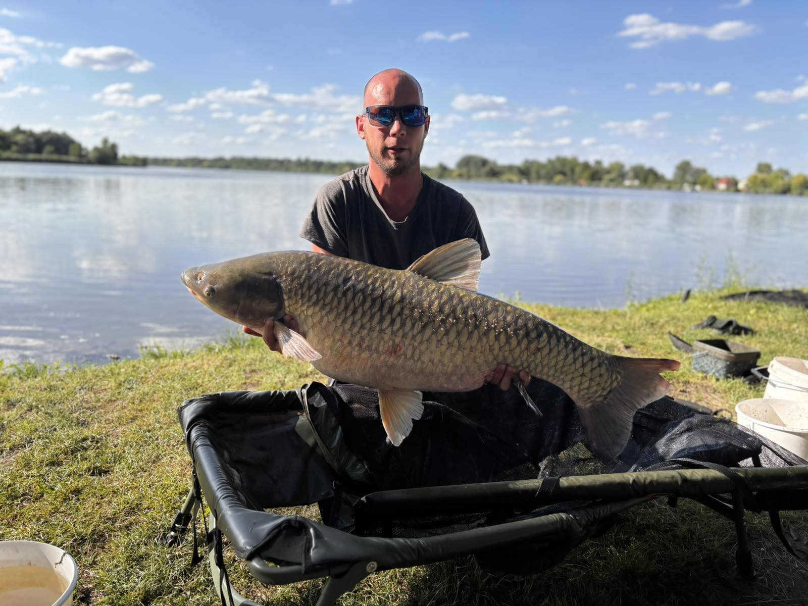 3,9 m-es 3,0 lbs bot, 0,35-ös monofil zsinór, 2-es horog. Büdös kukorica csali, etetés tigrismogyoróval. Napos idő, gyenge szél, 60 perces fárasztás partról.