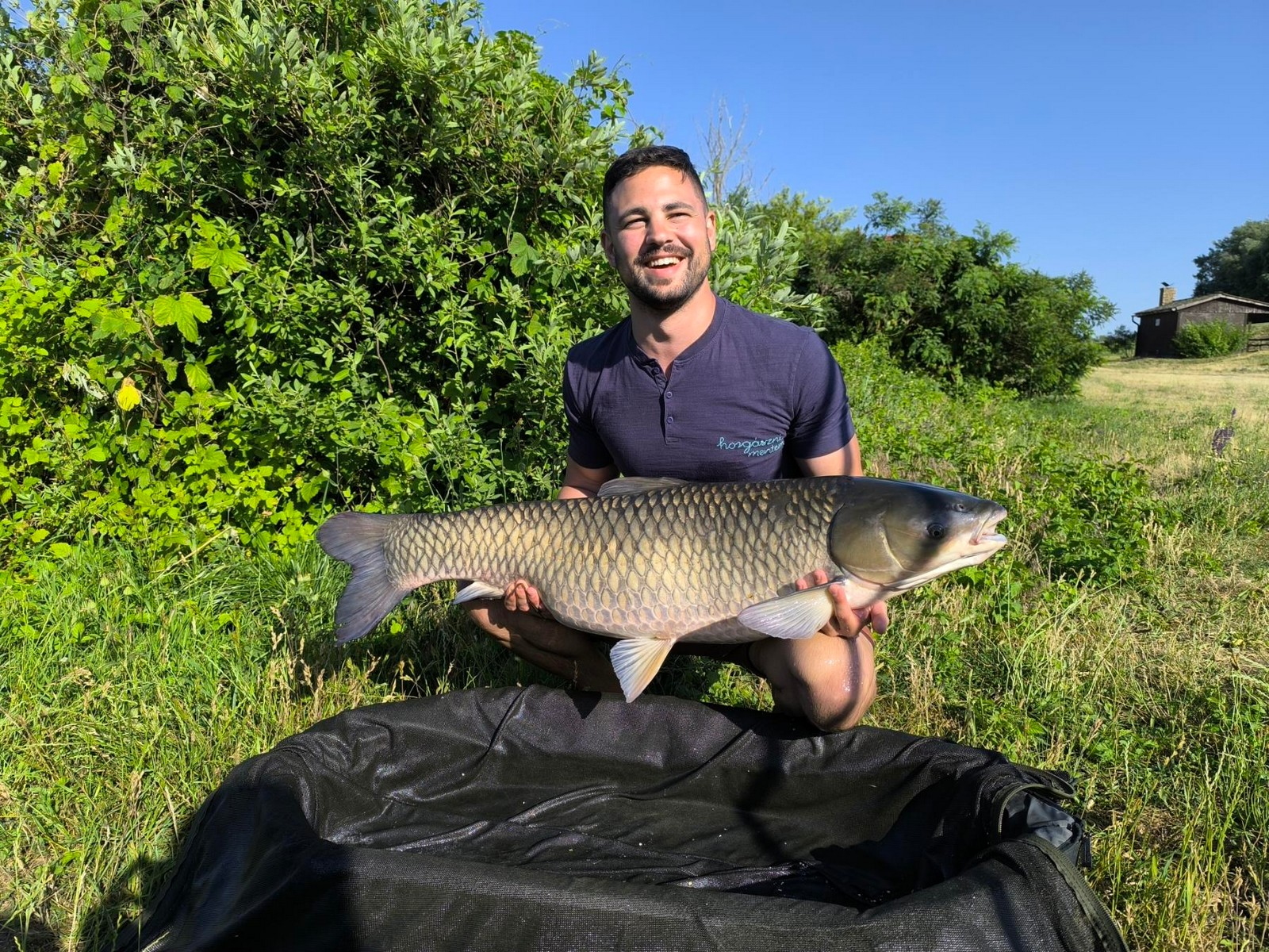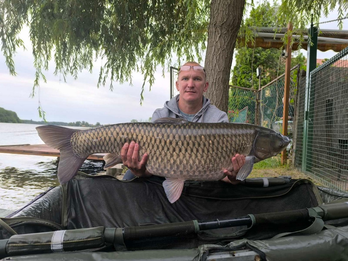 3,9 m-es 3,5 lbs bot, 0,30-as monofil zsinór, 2-es horog. Tigrismogyoró csali és etetés. Napos idő, erős északi szél, 25 perces fárasztás partról.