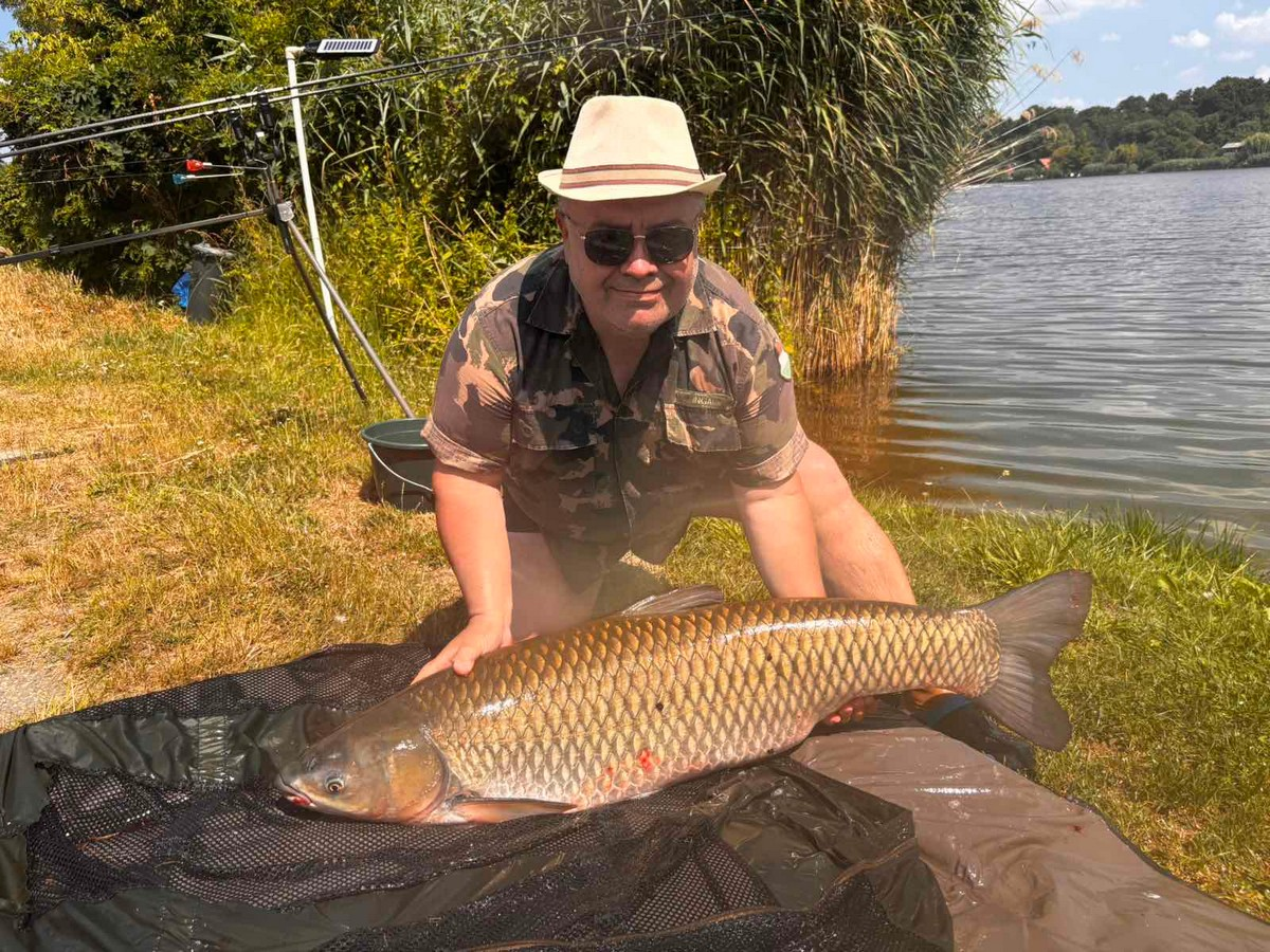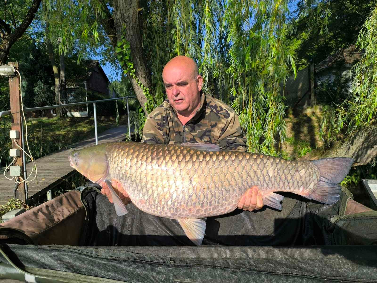 3 m-es 2,0 lbs bot, 0,35-ös monofil zsinór, 4-es horog. Tigrismogyoró csali és etetés. Napos idő, 20 perces fárasztás csónakból.