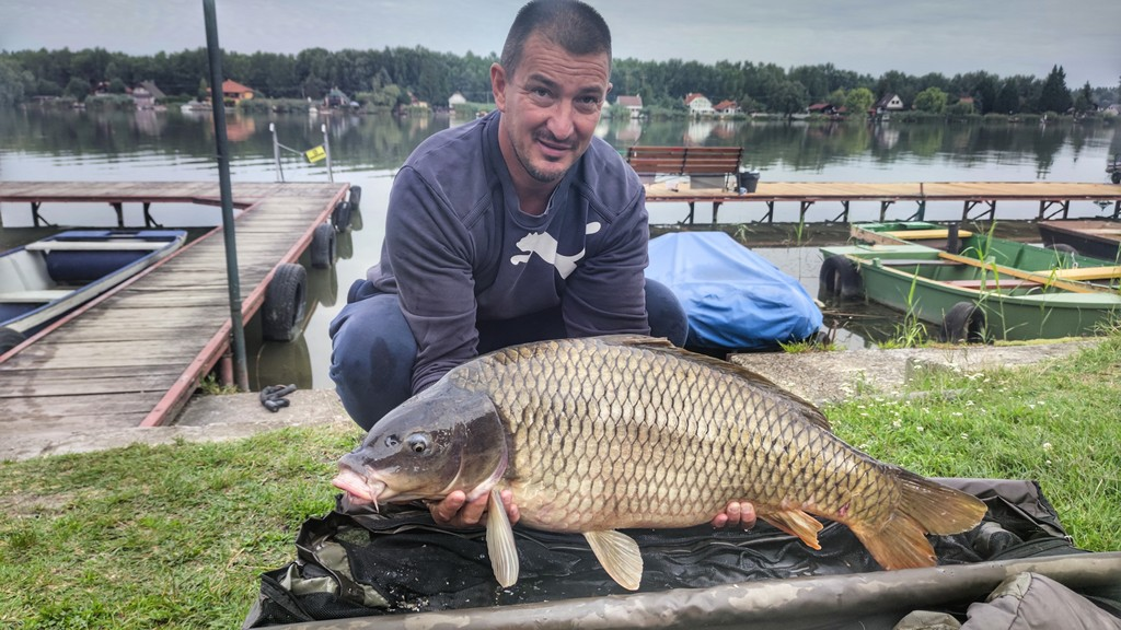 Bojlis bot, 0.30-es monofil zsinór, 4-es horog. Barackos bojli csali, etetés bojlival és kukoricával. 15 fok, szélcsend, 15 perces fárasztás csónakból.