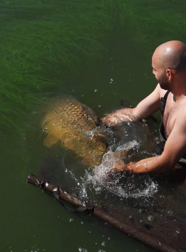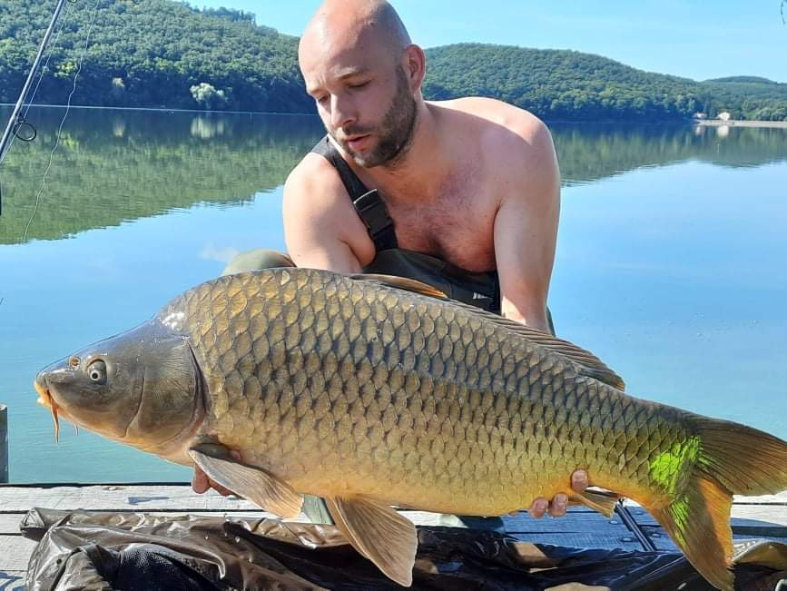 A fogást a horgász megbízásából a Rakaca-tó Horgász Egyesület töltötte fel. György Dávid beszámolója: Fogadjátok szeretettel beszámolómat egy rövid , de annál eseménydúsabb horgászatról. Augusztus 2-án reggel 10 óra körül kezdtük el a kipakolást a Rakaca-tó partjára, ahol egy rövid 24 órás pecát terveztünk. Az időjárás az előrejelzéseknek megfelelően egy igen markáns lehülést hozott így, elég nagy esőben és szélben történt a szerelékek összeállítása, de ez nem szeghette a kedvünket.Mire a felszerelést összeraktuk nagyjából dél körül, az időjárás is kezdte a szebbik arcát mutatni így hát csónakba szálltunk és 2 botot elhelyeztünk a már jól ismert és sokszor meghorgászott helyekre, amiket megetettünk egy kevés főtt kukoricából, tigrismogyoróból és bojliból álló keverékkel. Az egyik szerelékre itt dupla 20mm-es krill-kolbászos bojli került, míg a másikra szintén krill-kolbászos 20mm-es bojli egy ugyan ilyen ízű 12mm-es pop-up bojlival kikönnyítve és hóember szerelék formájában felkínálva. A másik két botnak ezután indultam csak neki helyeket keresni és nagyjából másfél óra alapos keresés és tapogatás után tettem le a voksomat 2 szimpatikusnal tűnő hely mellett, amiket dőlőbójákkal jelöltem és etettem meg. A kettőből az egyik bója egy 2,1 méteres vízbe került egy kemény kagylós részre míg a másik 2,5 méteres vízbe egy víz alatti hínarmező mellé. A sekélyebb vizben lévő bójánál ugyan azt a mixet használtam, mint amit korábban említettem és erre helyre tripla 20mm-es krill-kolbászos szerelék került, míg a másik bójámat kb 20-25 szem a csalizáshoz is használt 24mm-es spicy-fűszeres bojlival és nagyjából fél kilónyi tigrismogyoróval szórtam meg és csalinak a fent említett bojliból került kettő a horog mellé egy nagyon minimálisan megfaragva. Nagyjából délután 4 órára sikerült leülni a botok mellé a fotelekbe úgy, hogy minden a helyén volt és várhattuk a kapásokat. Az első hal este 7óra körül érkezett és az elsőként elhelyezett dupla 20-as krill-kolbászos szereléket húzta el egy 7,80 kilogrammos gyönyörű tőponty. Gyors mérlegelés és fotózás után már úszhatott is tovább, a szerelék pedig visszakerült a helyére. Kezdésnek nem is rossz! Ezt követően 11-kor már pont lefekvéshez készülődtünk ,amikor egy ismeretlen érdeklődő nagyon vehemens húzós kapással elhúzta a hóemberes szereléket. Egy gyors 5-6 perces farasztás után már a bölcsőben pihent egy 6 kg körüli tőponty. Őt már nem is vittük ki a partra, hanem a csónakból visszaengedtük, majd a szerelék visszakerült a helyére és így indultunk kifelé. Ezt követően egy rövid alvás következett egészen fél 3-ig, amikor is egy maszatolós ejtős kapásra keltünk a legtávolabbi 2,5 métetres mélységben elhelyezett botra érkezett az érdeklődő. Ahogy a hal felé értünk a csónakkal és ráemeltem egyből éreztem, hogy ez nem az eddigi 6-8 kg-os példányokból lesz egy újabb. Folyamatos komótos úszással forgatta a csónakot alattunk az ismeretlen vendég, aki nagyjából 15 perc után mutatta meg magát a felszínen a lámpánk fényében. Gyönyörű hosszúkás pikkelyes volt, de ezután újra a meder felé vette az irányt és még kb 10 percig küzdöttünk egymással, mire ellenfelem megadta magát és felfeküdtt a víz felszínére. Én ekkor realizáltam csak, hogy nagy valószínűséggel az új egyéni rekordom pihen a merítőmben. Óriási volt az öröm természetesen, nem is akartam elhinni, hogy egy ilyen igazi rakacai vadpontyot sikerült fognom az idei első horgászatomon. Ezután még fogtunk egy 6 kg-os formát hajnali 5.00 körül,de én termeszetesen alig vártam a reggeli fotozást, mérlegelést és hitelesítést amiben a helyi halőrök Vaszilkó Sándor és Kondás László készségesen és profi módon a segítségünkre álltak. A hal a mérések után 104 cm hosszúnak, 74 cm átmérőjűnek és 18,70 kg-nak bizonyult, ami nekem óriási egyéni rekord és egy felejthetetlen élmény. Ami külön öröm, hogy egyre több ilyen fogásról lehet hallani a tavon és remélem ez a tendencia csak tovább folytatódik. Itt mégegyszer szeretnem megköszönni a halőröknek, hogy gyorsan kiérkeztek és segítettek az adminiszttracióban és közben megörökítették ezeket a csodás pillanatokat a mérlegeléstől egészem a visszaengedésig. Köszönöm Rakaca-tó! Az új cél innentől nem is lehet más mint egy 20 kg feletti ponty becserkészese ebből a gyönyörű tóból!