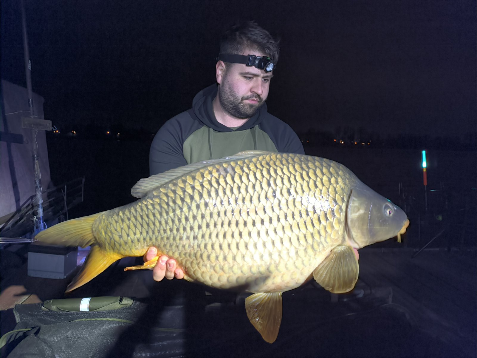 3,15 m-es 1,5 lbs bojlis bot, 0,35-ös monofil zsinór, 4-es horog. Bojli csali és etetés. Hűvös idő, erős szél, 20 perces fárasztás csónakból.
