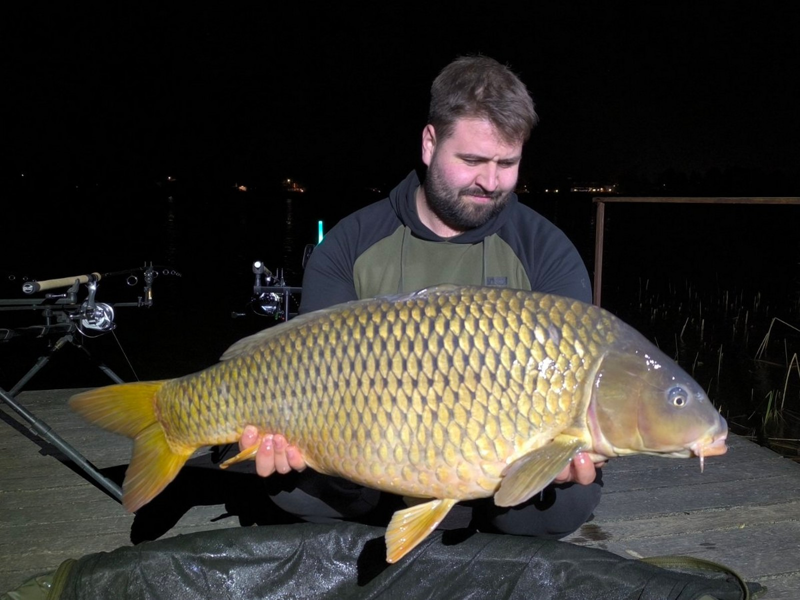 2,7 m-es 10-40 grammos bot, 0,35-ös monofil zsinór, 6-os horog. Bojli csali és etetés. Derült idő, szélcsend, kb. 15 perces fárasztás csónakból.