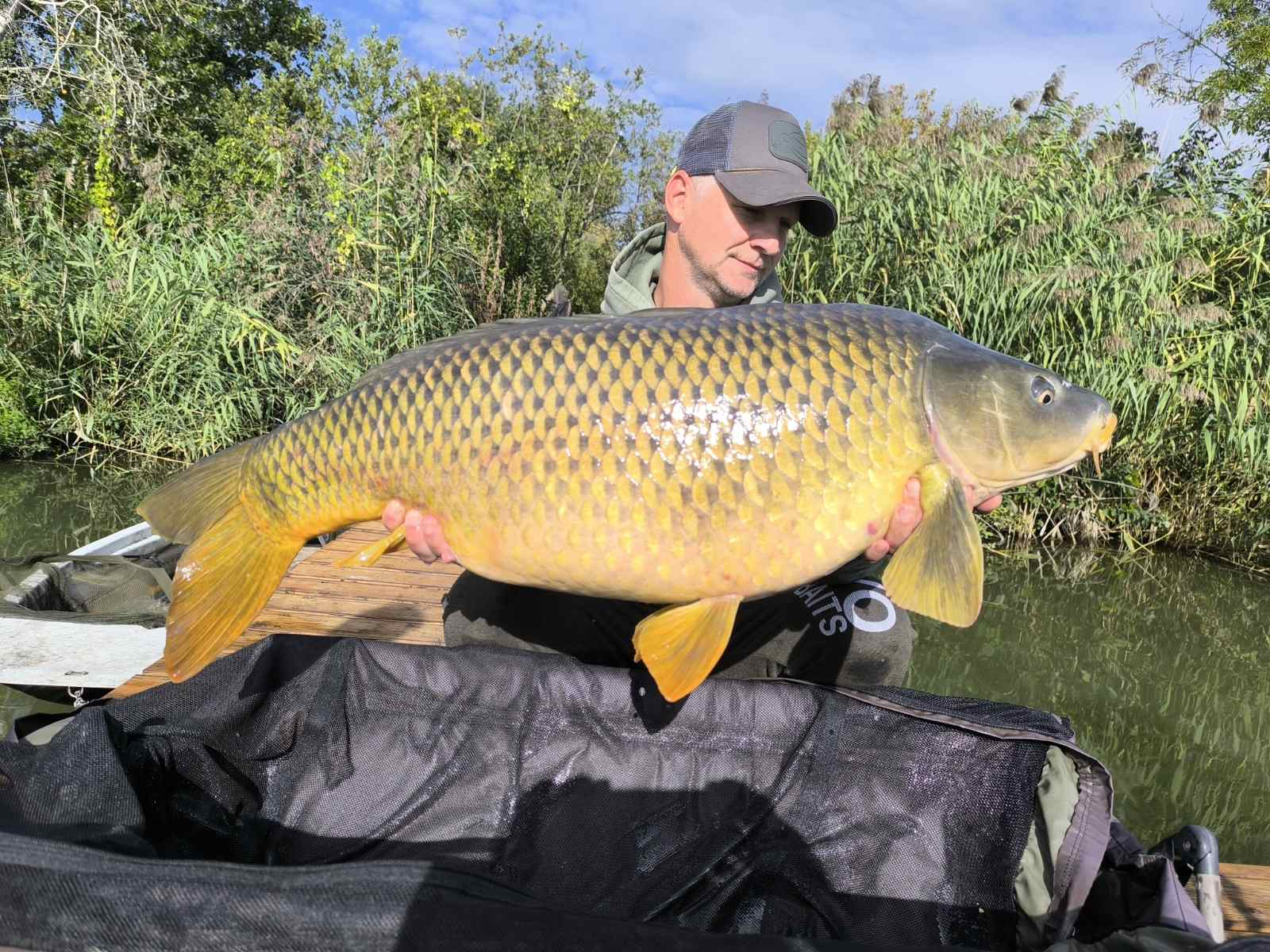 3 m-es 3,0 lbs bot, 0,35-ös monofil zsinór, 4-es horog. Bojli csali és etetés. Derült idő, szélcsend, 10 perces fárasztás csónakból.