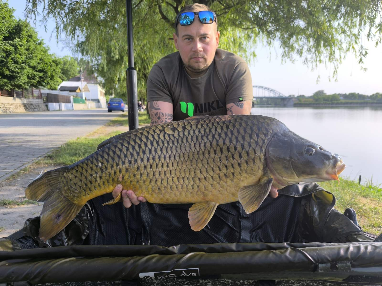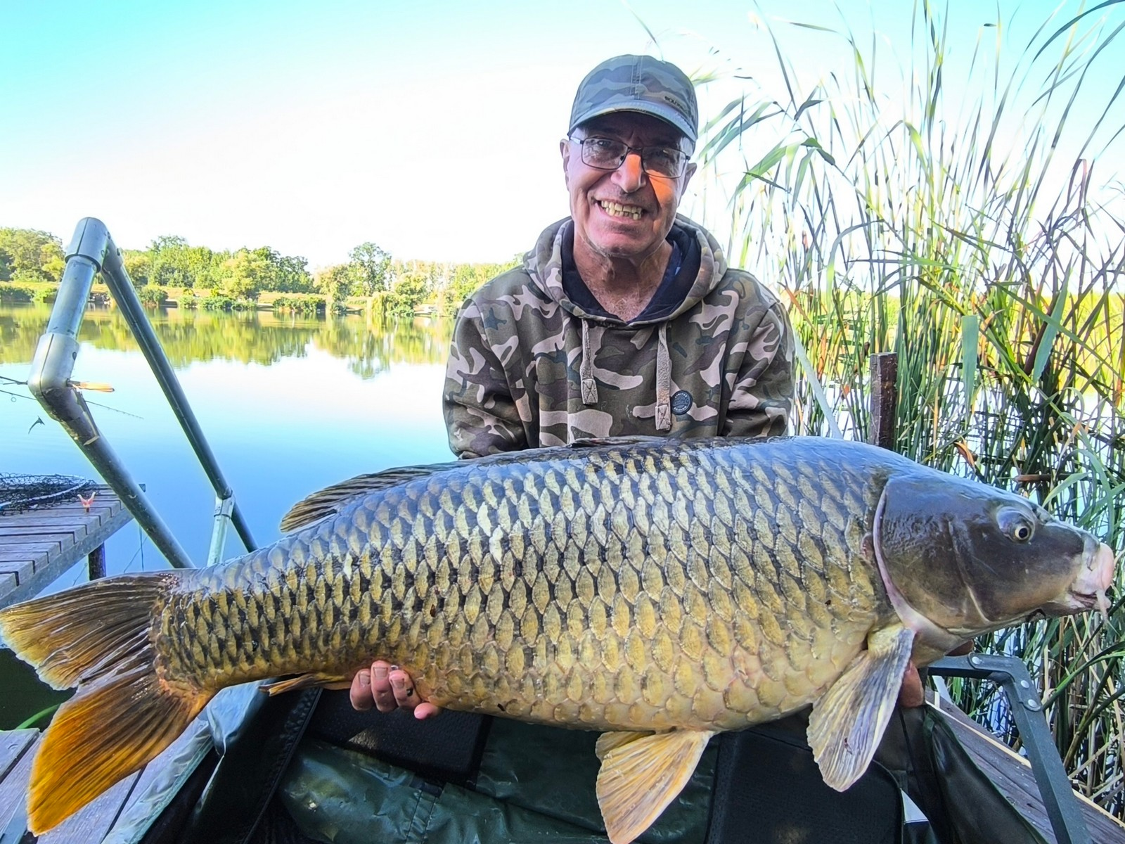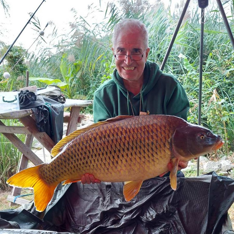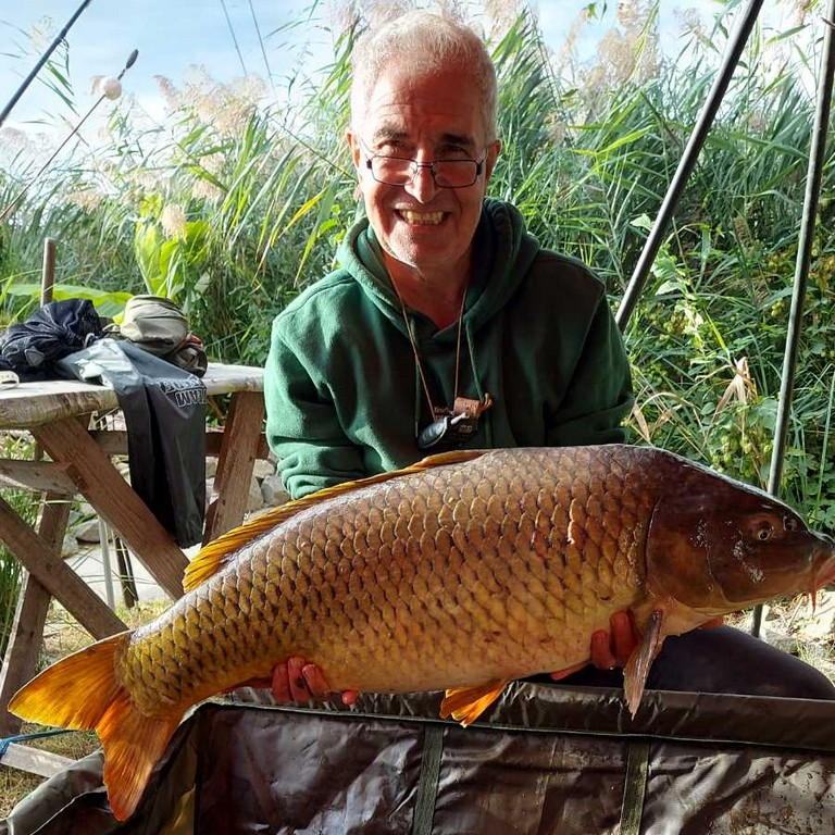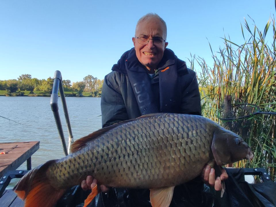 3,3 m-es 3,0 lbs bot, 0,34-es monofil zsinór, 4-es horog. Bojli csali és etetés. Derült idő, szélcsend, 15 perces fárasztás csónakból.