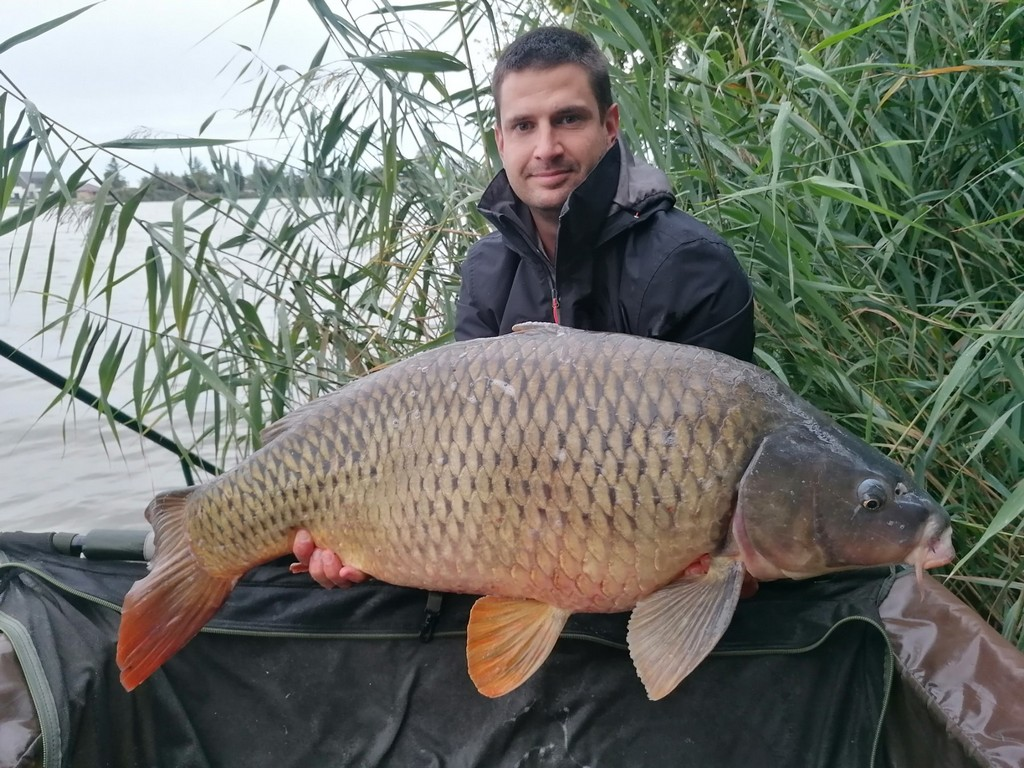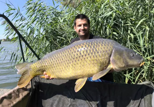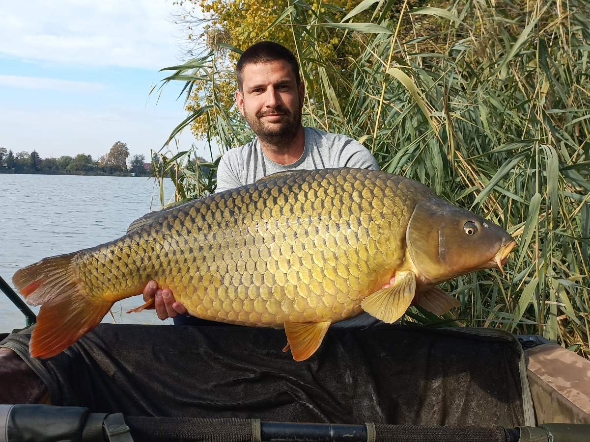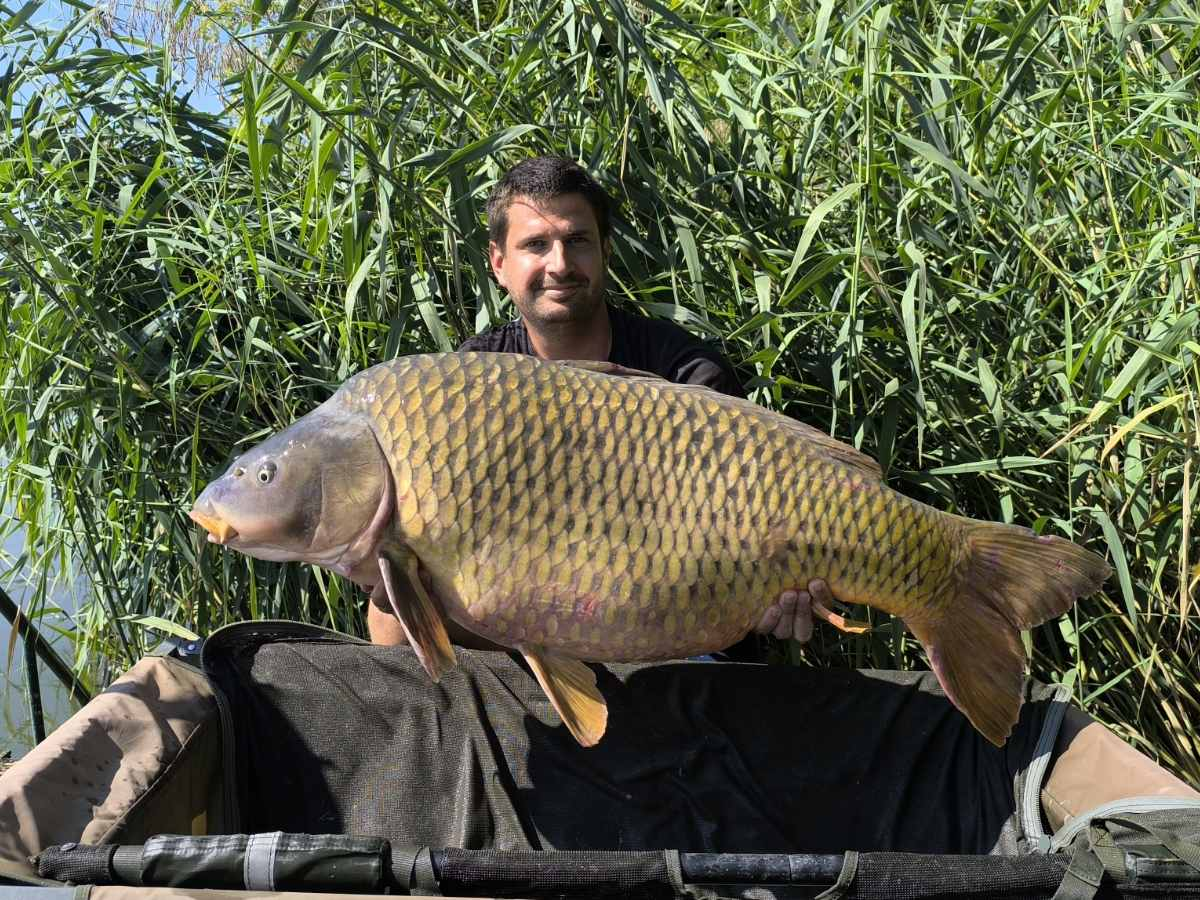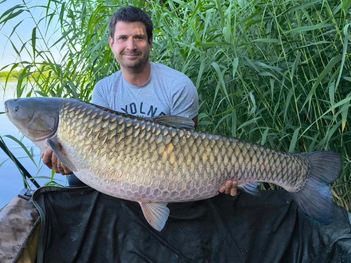 2,7 m-es 2,5 lbs bot, 0,35-ös monofil zsinór, 4-es horog. Tigrismogyoró csali, etetés magvakkal. Derült idő, szélcsend, kb. 10 perces fárasztás csónakból.