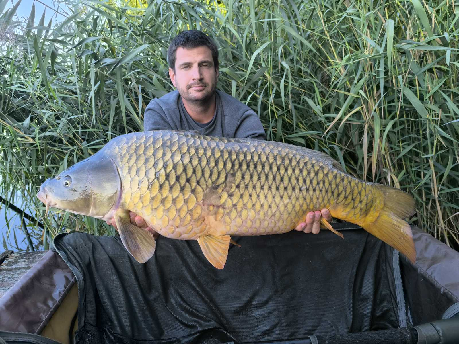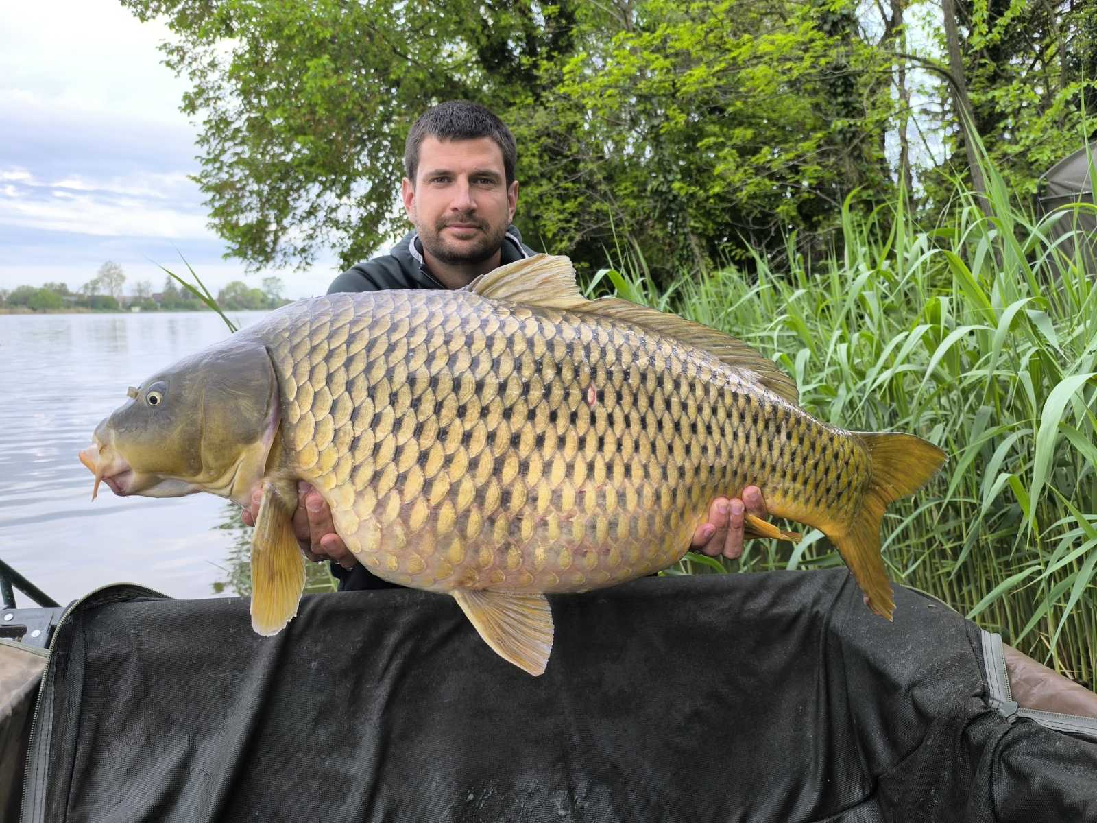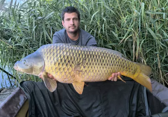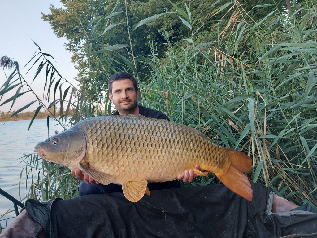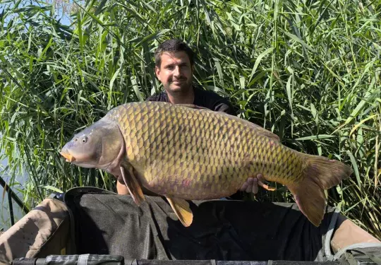 2,7 m-es 2,5 lbs bot, 0,35-ös monofil zsinór, 4-es horog. Tigrismogyoró csali, etetés magvakkal. Derült idő, szélcsend, kb. 10 perces fárasztás csónakból.