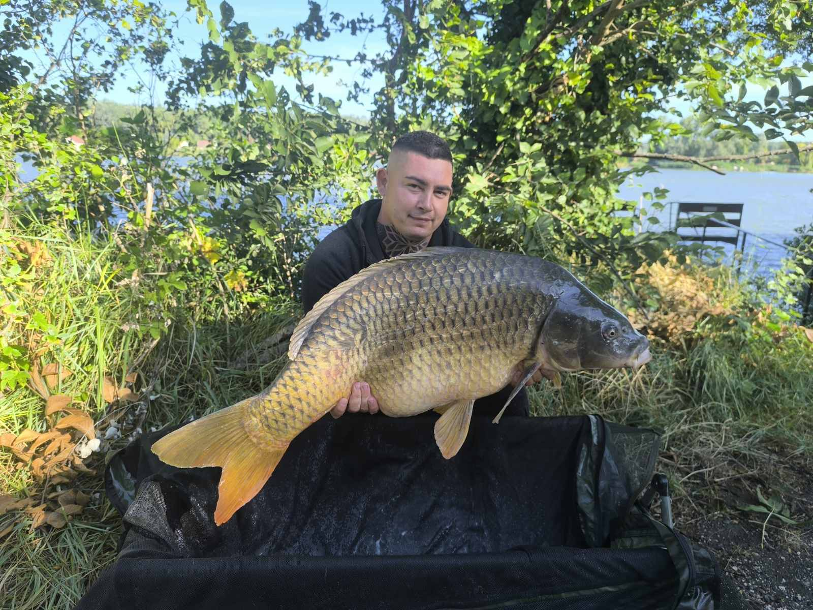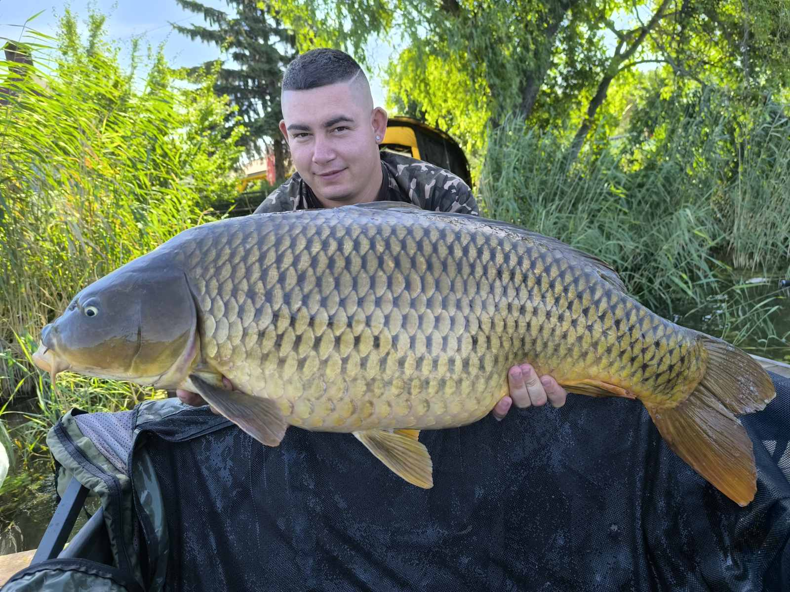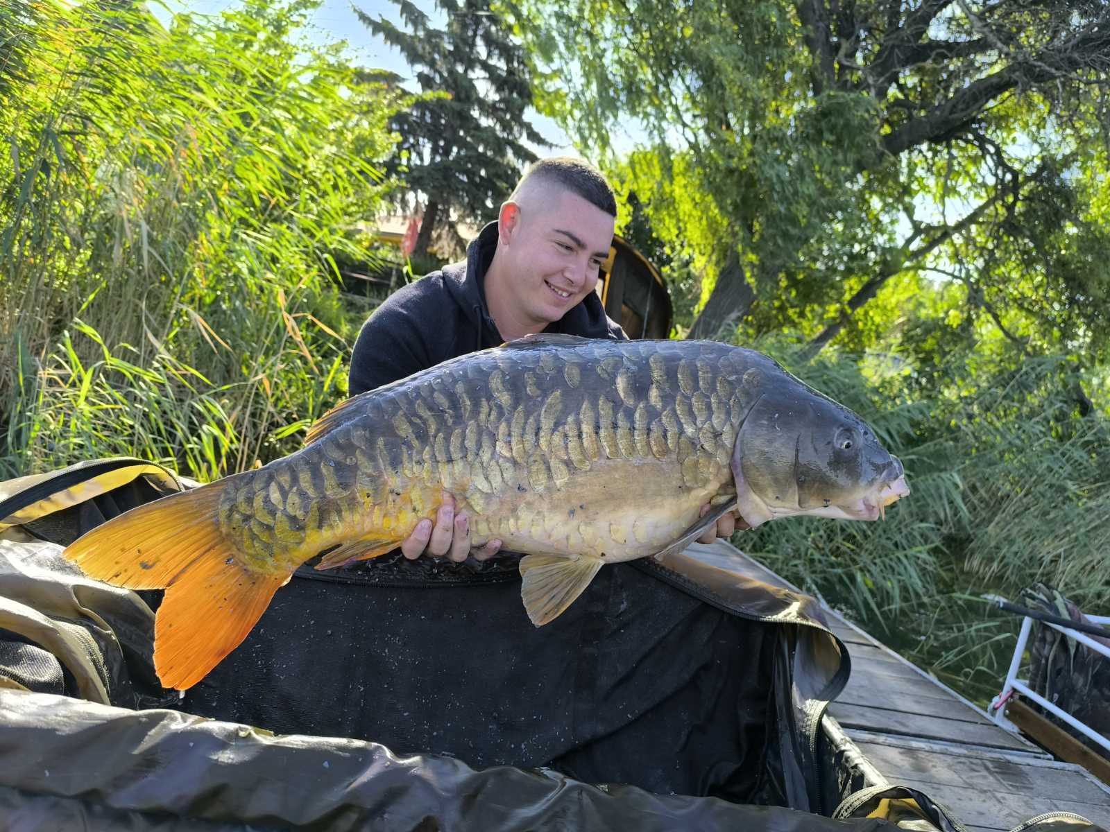 3 m-es 2,75 lbs bot, 0,35-ös monofil zsinór, 4-es horog. Bojli csali és etetés. Derült idő, szélcsend, kb. 15 perces fárasztás partról.