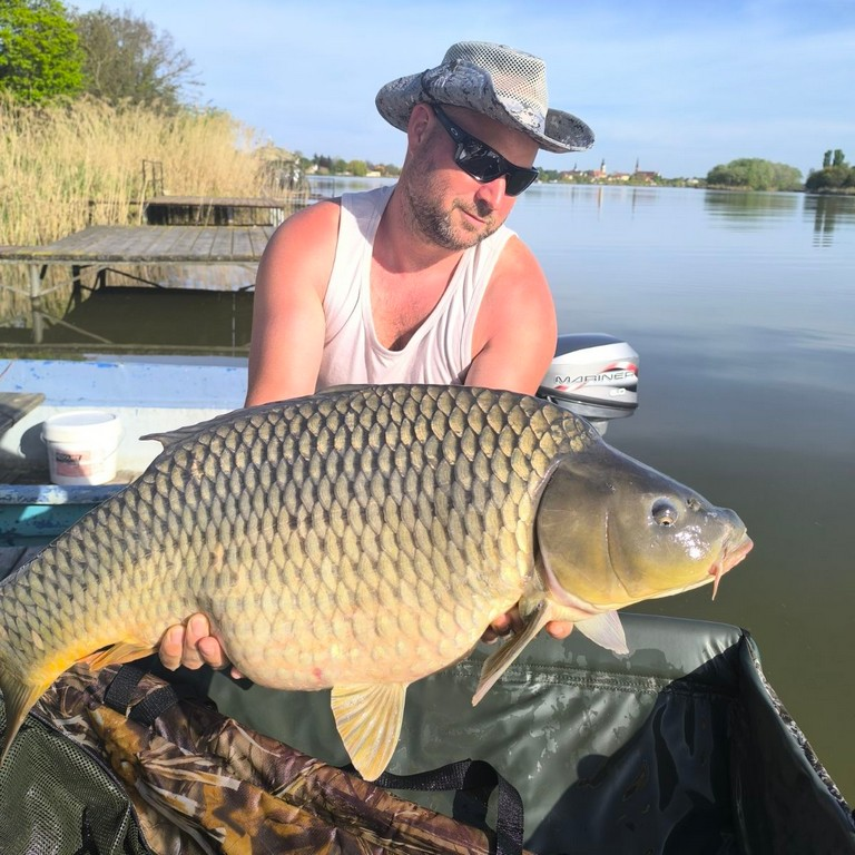 3,9 m-es 3,5 lbs bot, 0.36-os monofil zsinór, 2-es horog. Bojli csali és etetés. Szélcsend, 15 perces fárasztás partról.