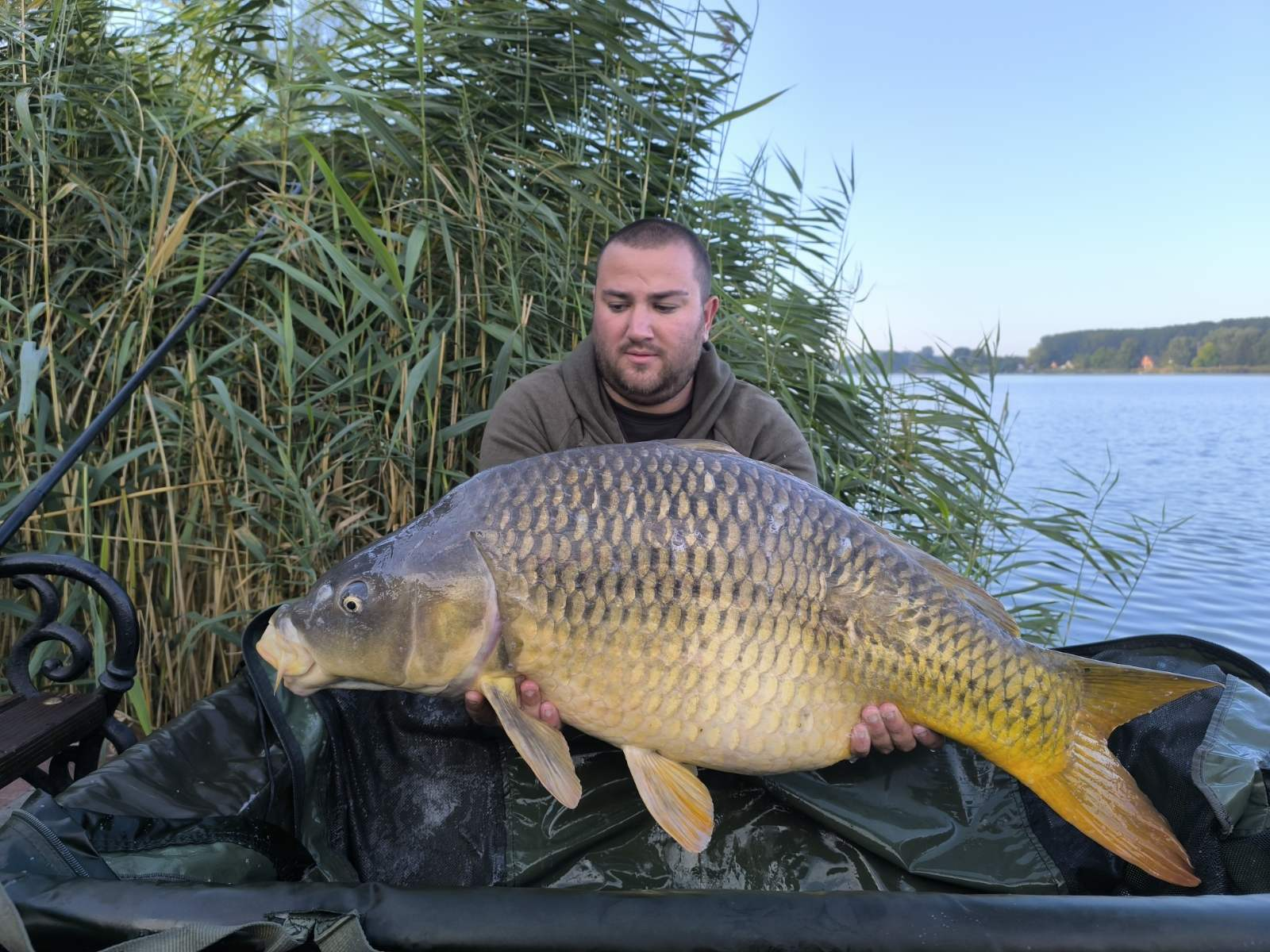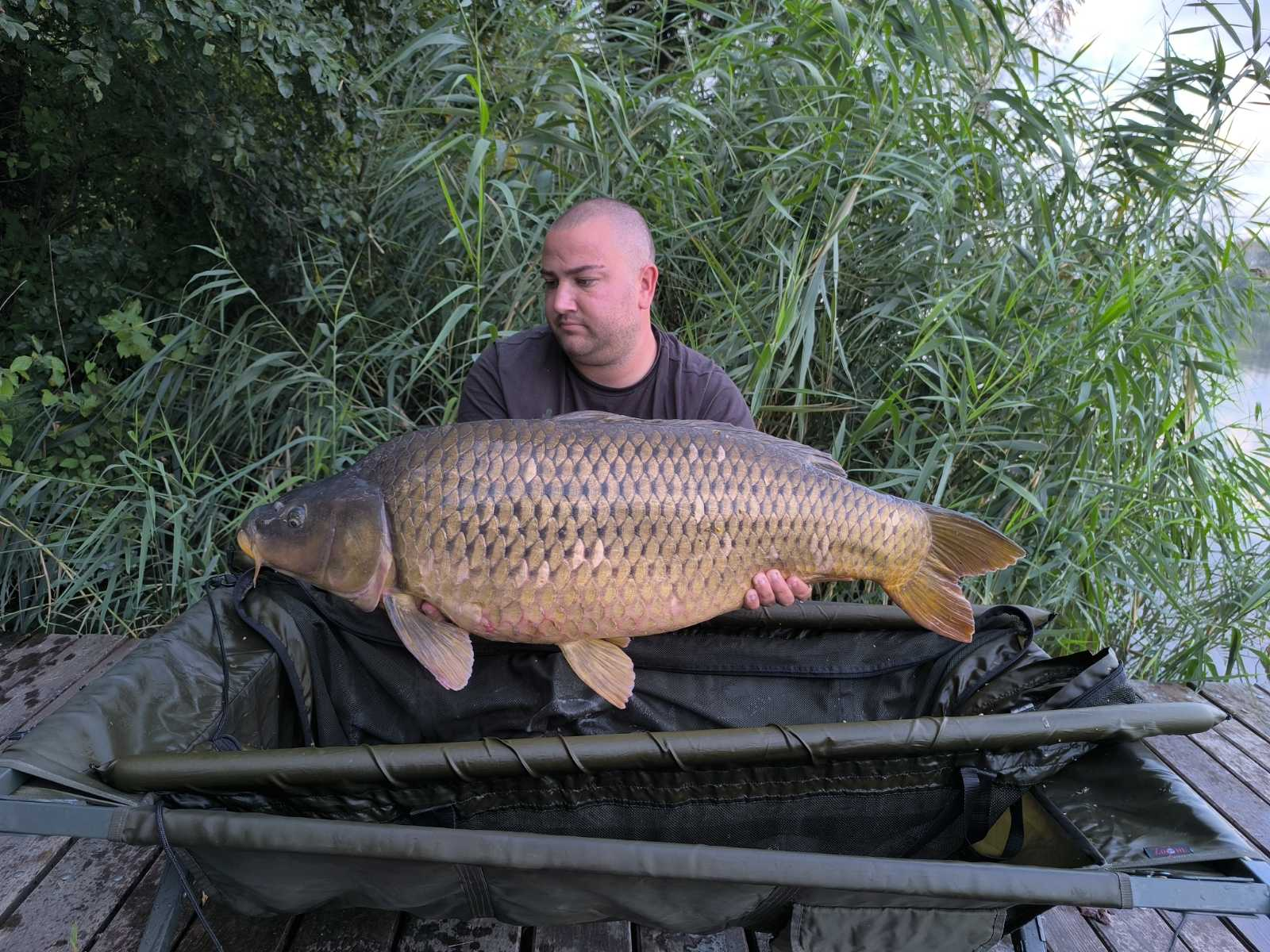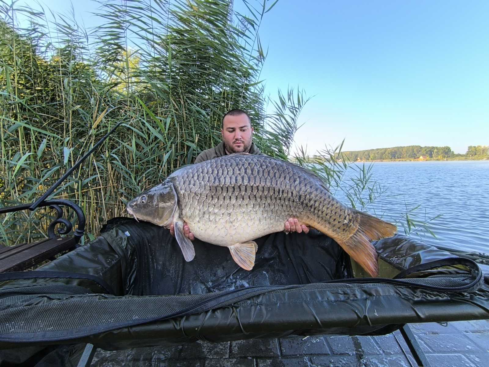 3 m-es 2,55 lbs bot, 0,35-ös monofil zsinór, 2-es horog. Bojli csali és etetés. Derült idő, szélcsend, 15 perces fárasztás partról.