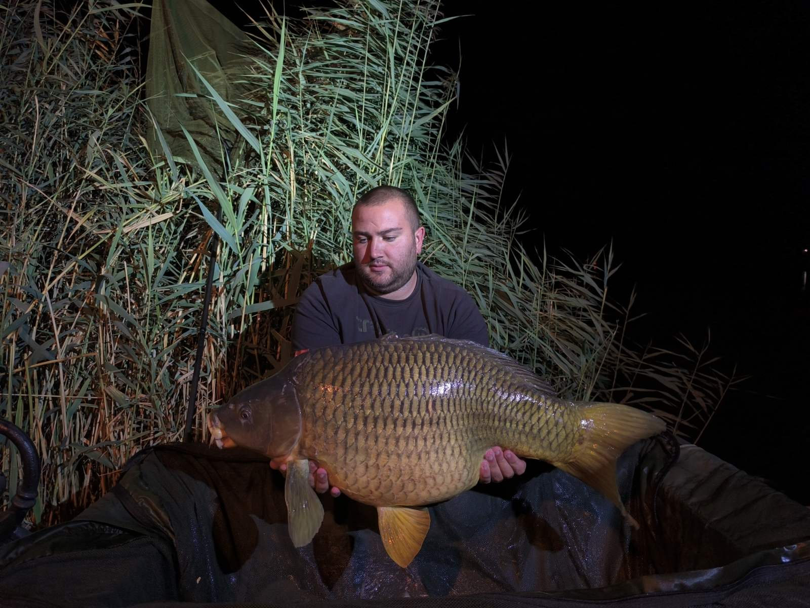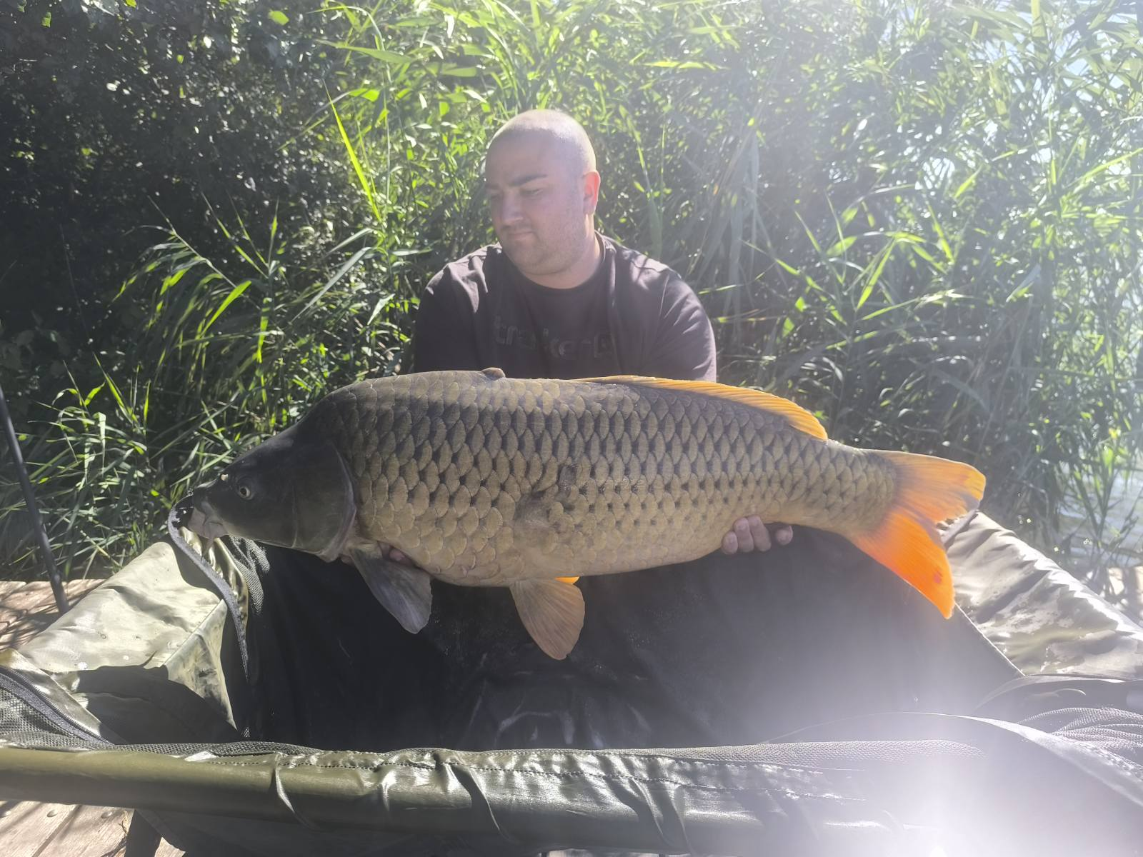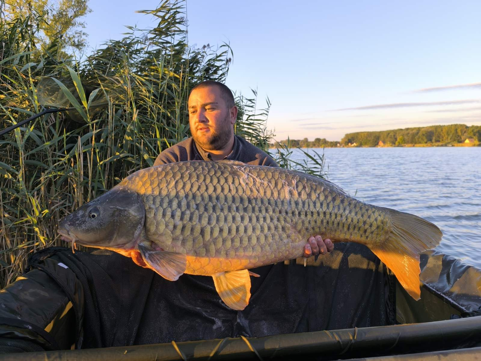 3 m-es 2,55 lbs bot, 0,35-ös monofil zsinór, 2-es horog. Bojli csali és etetés. Derült idő, szélcsend, 15 perces fárasztás partról.