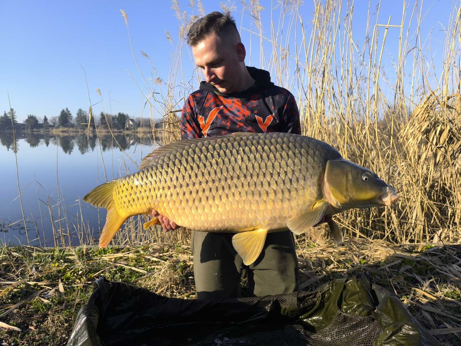 3,6 m-es 3,5 lbs bot, 0,40-es fonott zsinór, 4-es horog. Bojli csali és etetés. Szélcsend, 15 perces fárasztás partról.
