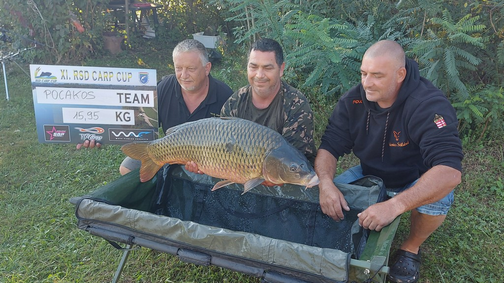 3 m-es 2,5 lbs bot, 0.35-ös monofil zsinór, 4-es horog. Bojli csali, etetés bojlival csónakból. Szélcsend, 10 perces fárasztás csónakból. Az RSD Carp Cup bojlis versenyen fogott hal.