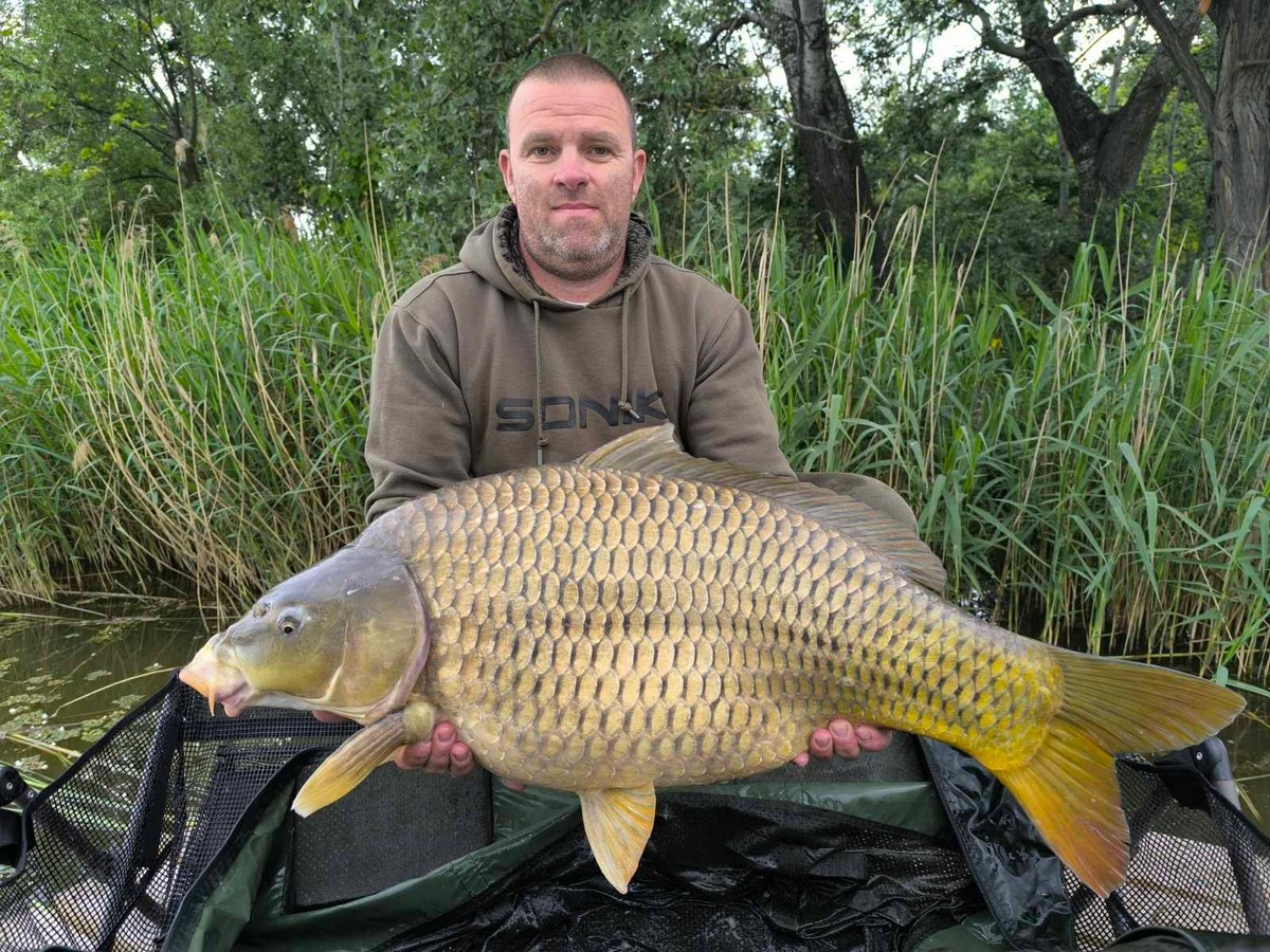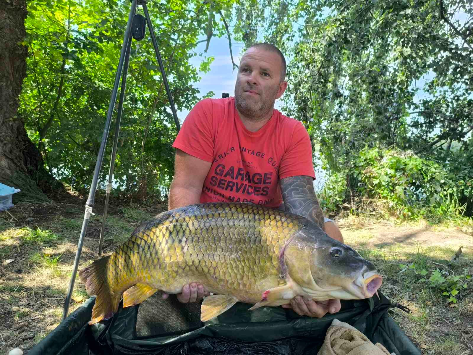 3,6 m-es 3,25 lbs bot, 0,35-ös monofil zsinór, 4-es horog. Tigrismogyoró csali és etetés. Napos, meleg idő, szélcsend, 20 perces fárasztás partról.