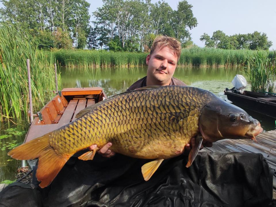 3 m-es 2,0 lbs bot, 0,35-as monofil zsinór, 6-os horog. Bojli csali és etetés. Derült idő, gyenge szél, kb. 15 perces fárasztás csónakból.