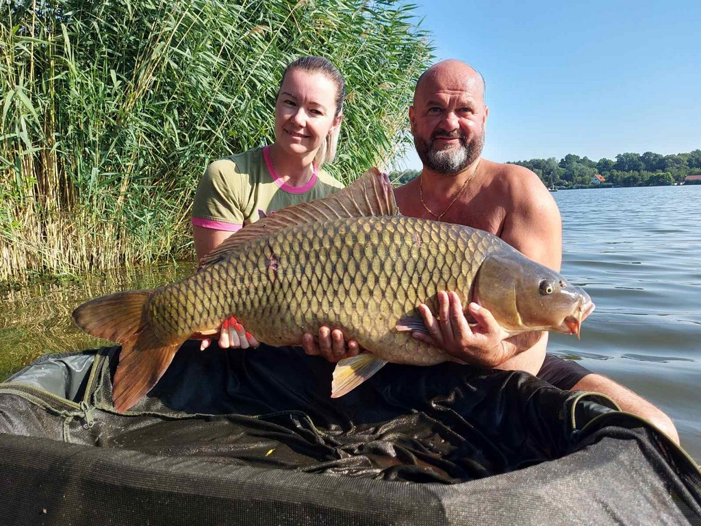 2,7 m-es 2,0 lbs bot, 0,35-ös fonott zsinór, 4-es horog. Bojli csali, etetés bojlival és tigrismogyoróval. 15 perces fárasztás csónakból.