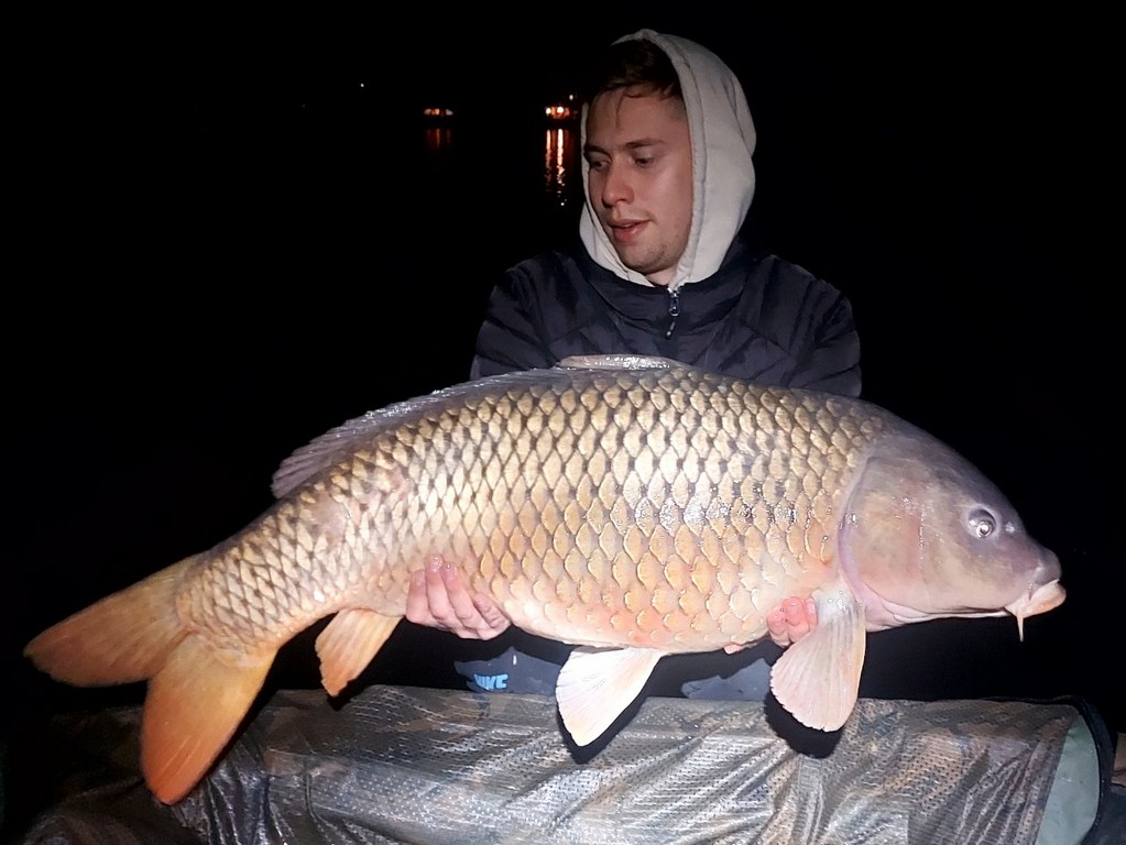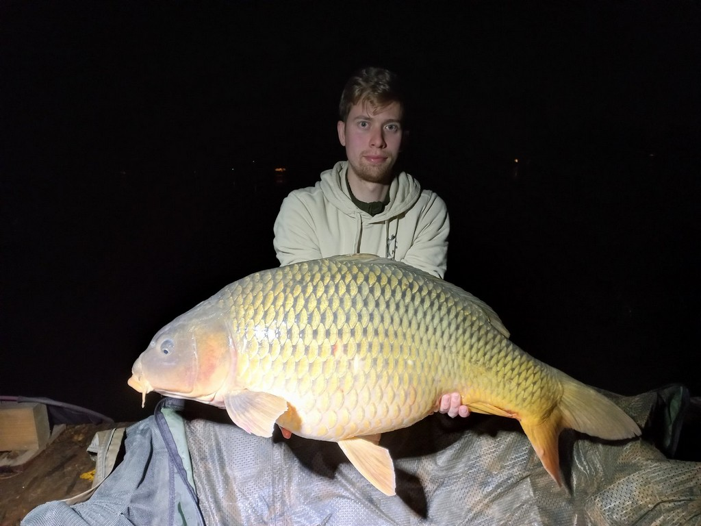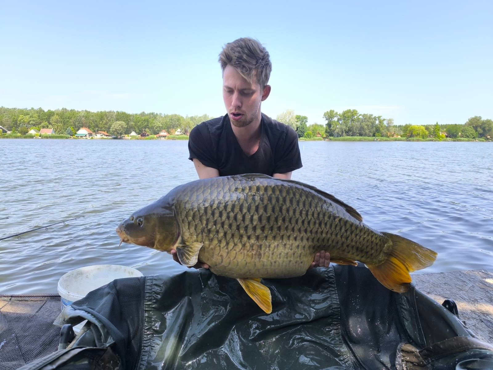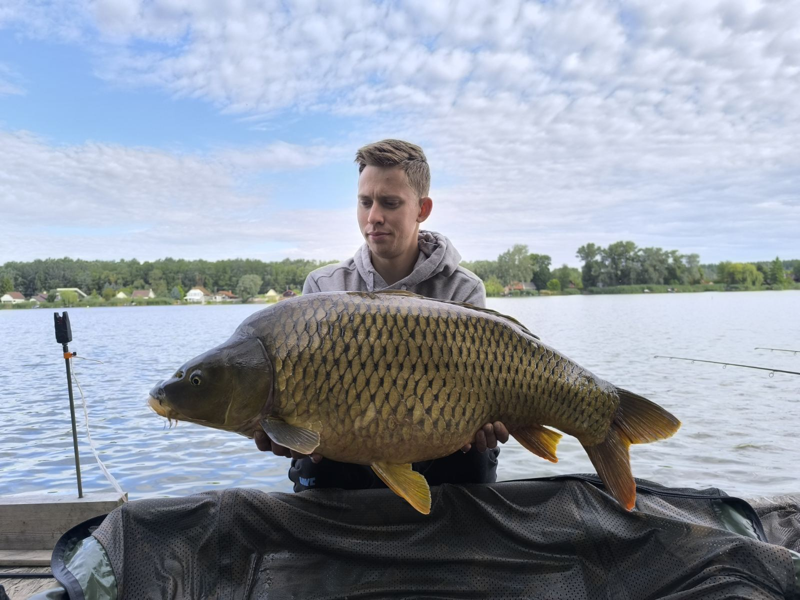 3,6 m-es 3,5 lbs bot, 0.35-ös monofil zsinór, 6-os horog. Bojli csali és etetés. Gyenge szél, 45 perces fárasztás csónakból.