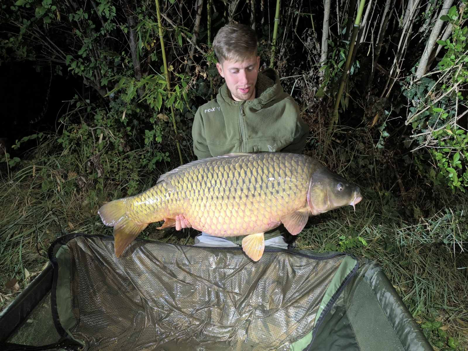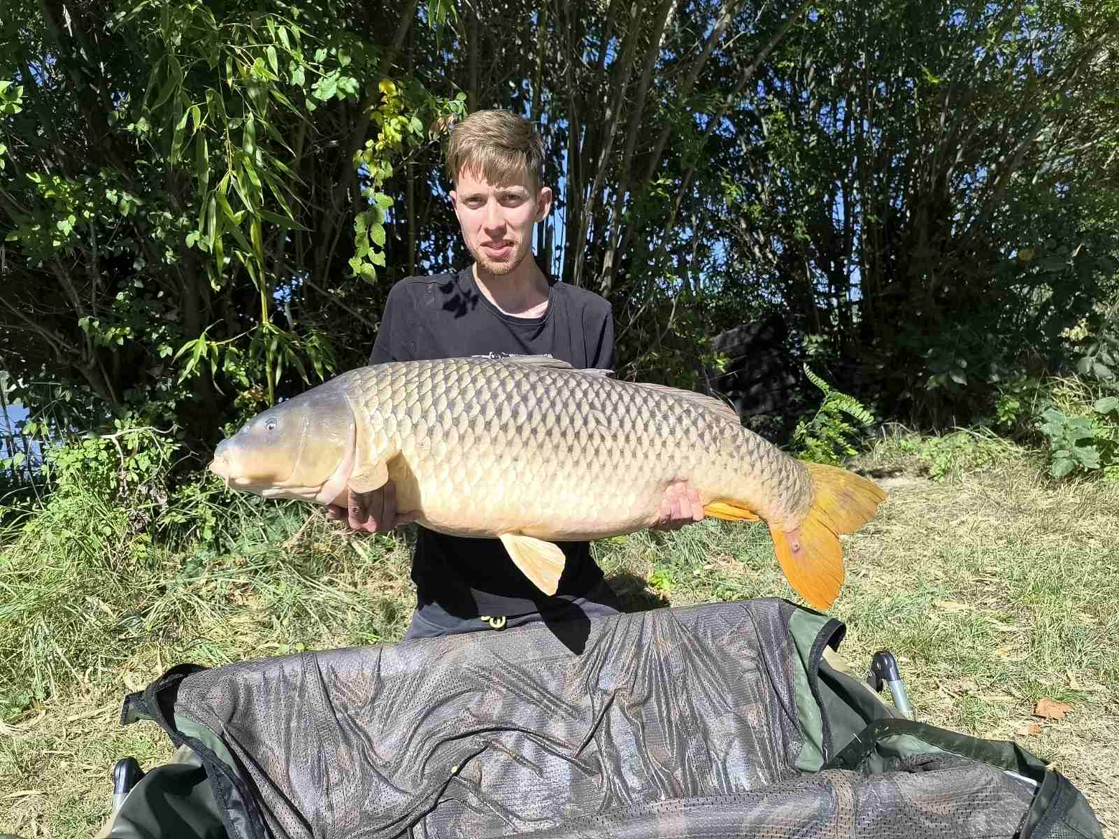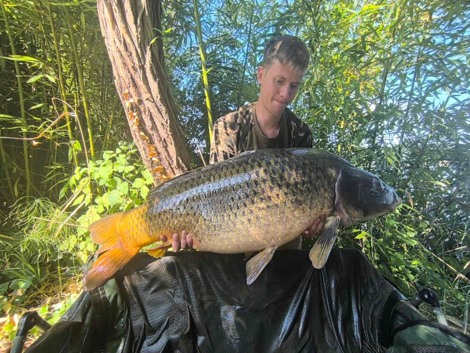 3,6 m-es 3,5 lbs bot, 0.35-ös monofil zsinór, 6-os horog. Bojli csali és etetés. Gyenge szél, 45 perces fárasztás csónakból.