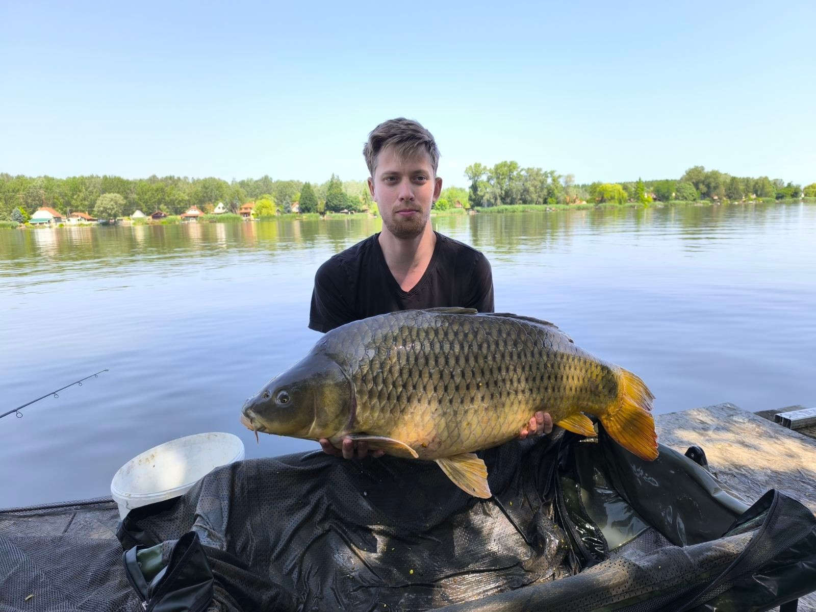 2,7 m-es 2,5 lbs bot, 0,35-ös monofil zsinór, 4-es horog. Bojli csali és etetés. Napos idő, szélcsend, 15 perces fárasztás csónakból.