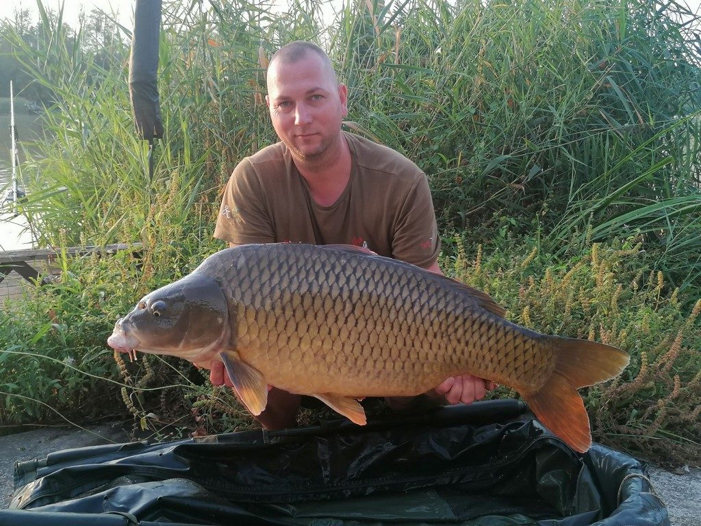 3,9 m-es 3,5 lbs bot, 0.33-as monofil zsinór, 4-es horog. Bojli csali és etetés. Napos idő, szélcsend, 10 perces fárasztás partról.