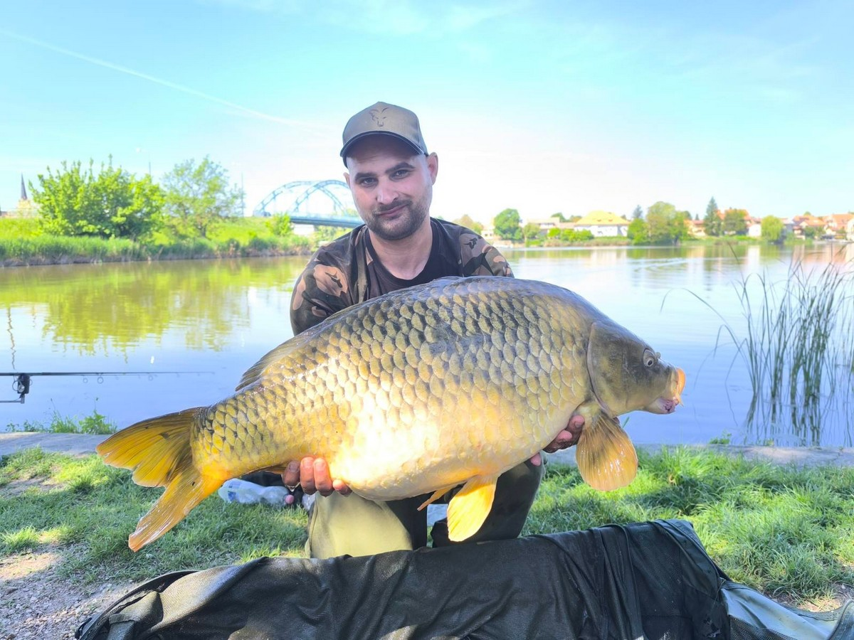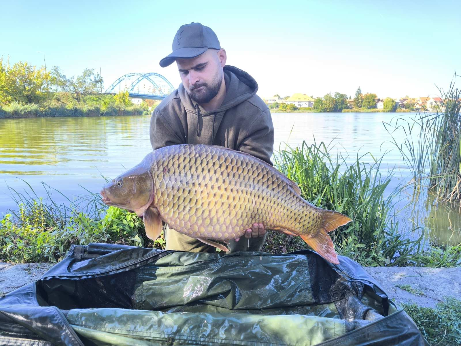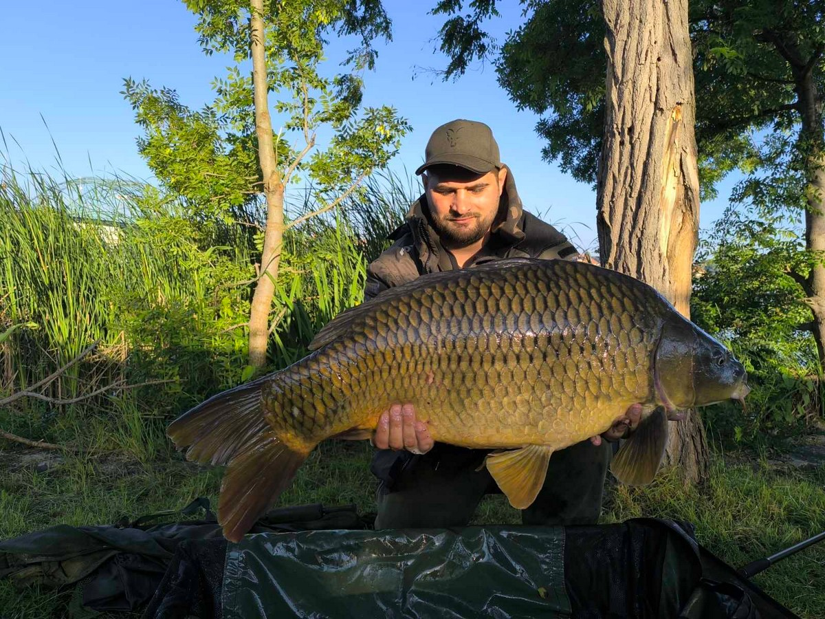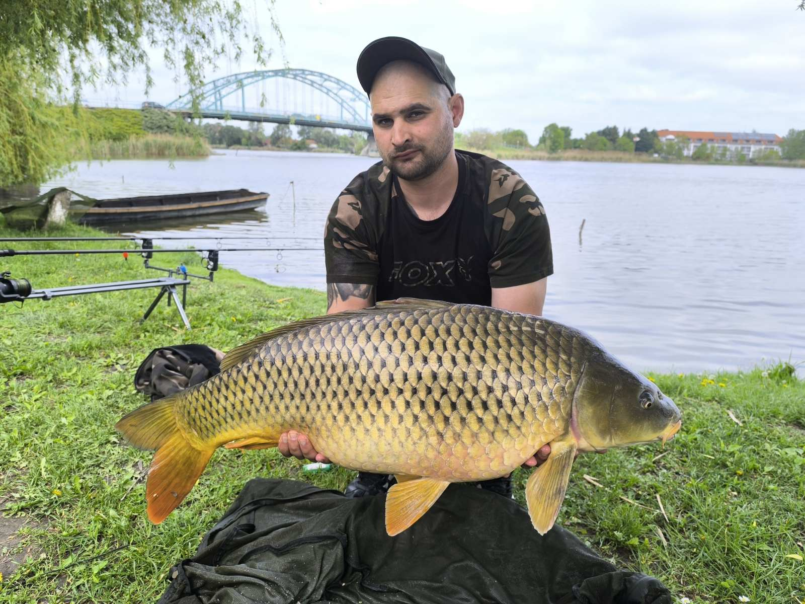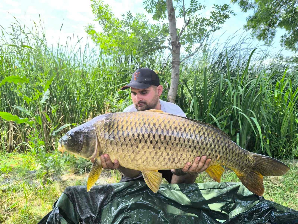 3,6 m-es 3,5 lbs bot, 0,35-ös monofil zsinór, 2-es horog. Bojli csali és etetés. Meleg, napos idő, szélcsend, 20 perces fárasztás partról.