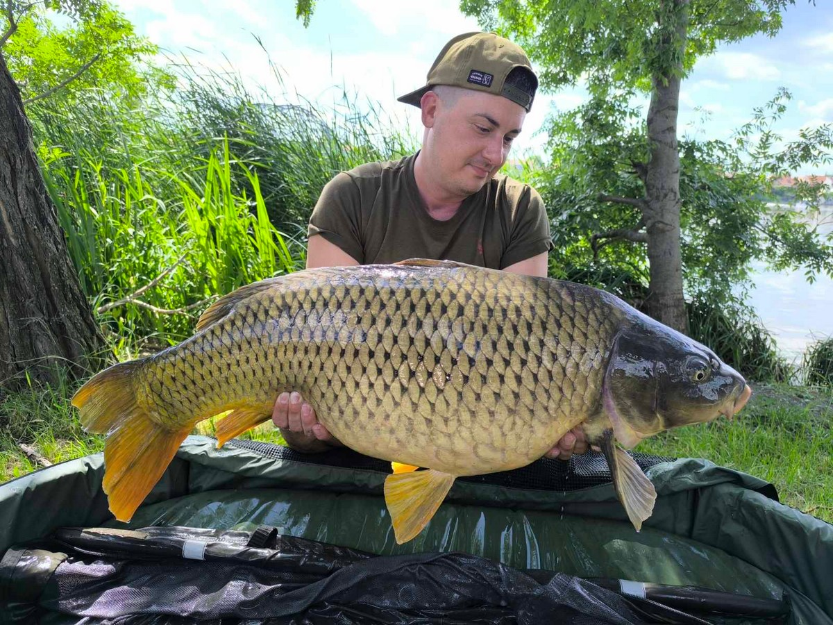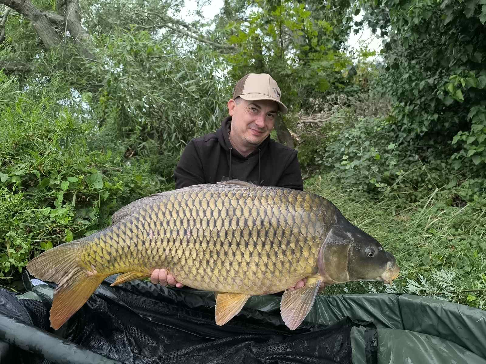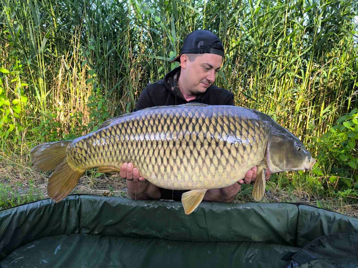 3,6 m-es 2,7 lbs bot, 0,35-ös monofil zsinór, 4-es horog. Bojli csali és etetés. Meleg, napos idő, 15 perces fárasztás partról.