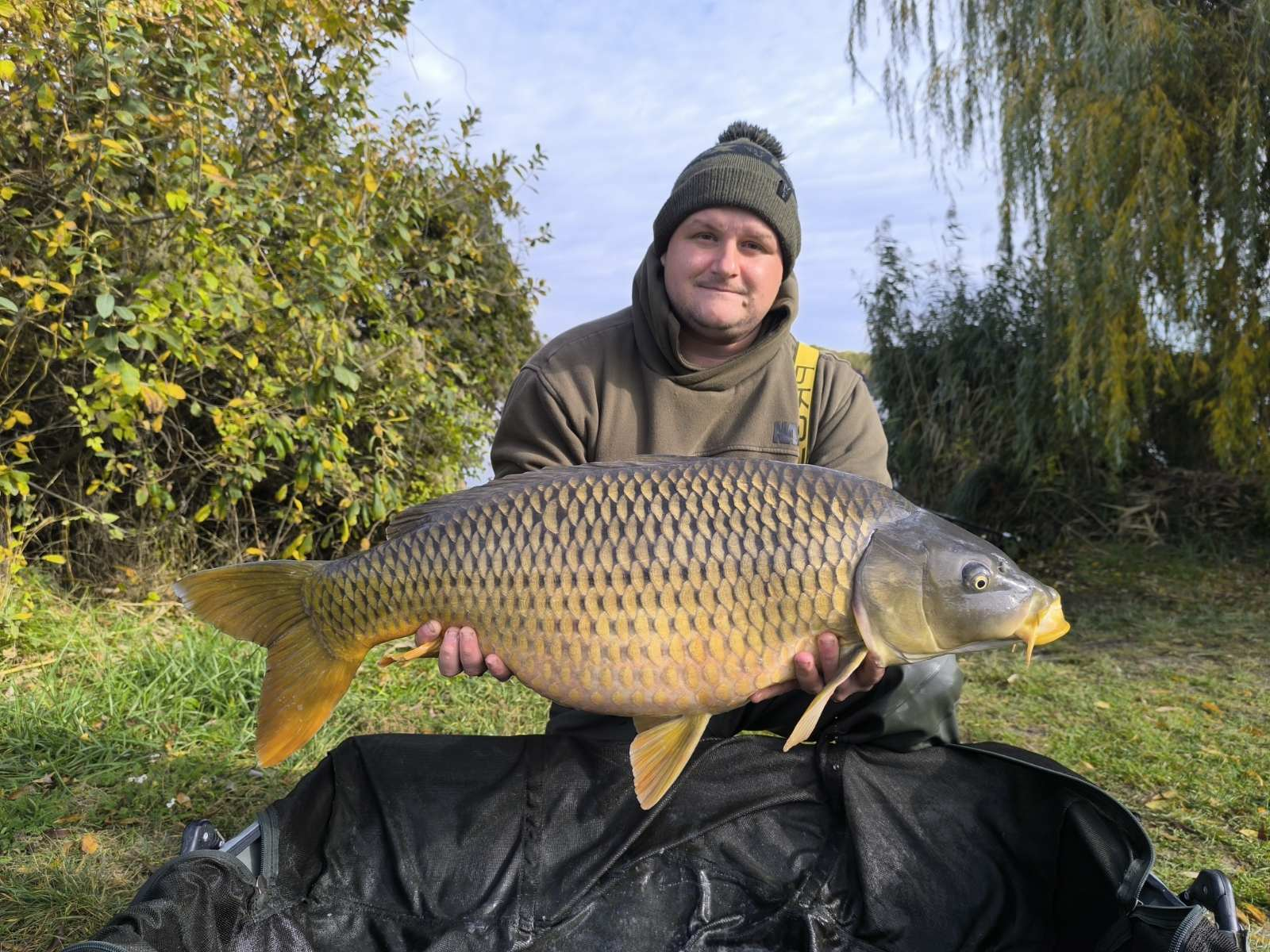 3,9 m-es 3,5 lbs bot, 0,27-es monofil zsinór, 4-es horog. Kukorica csali, etetés magvakkal. Borús idő, 25 perces fárasztás partról.