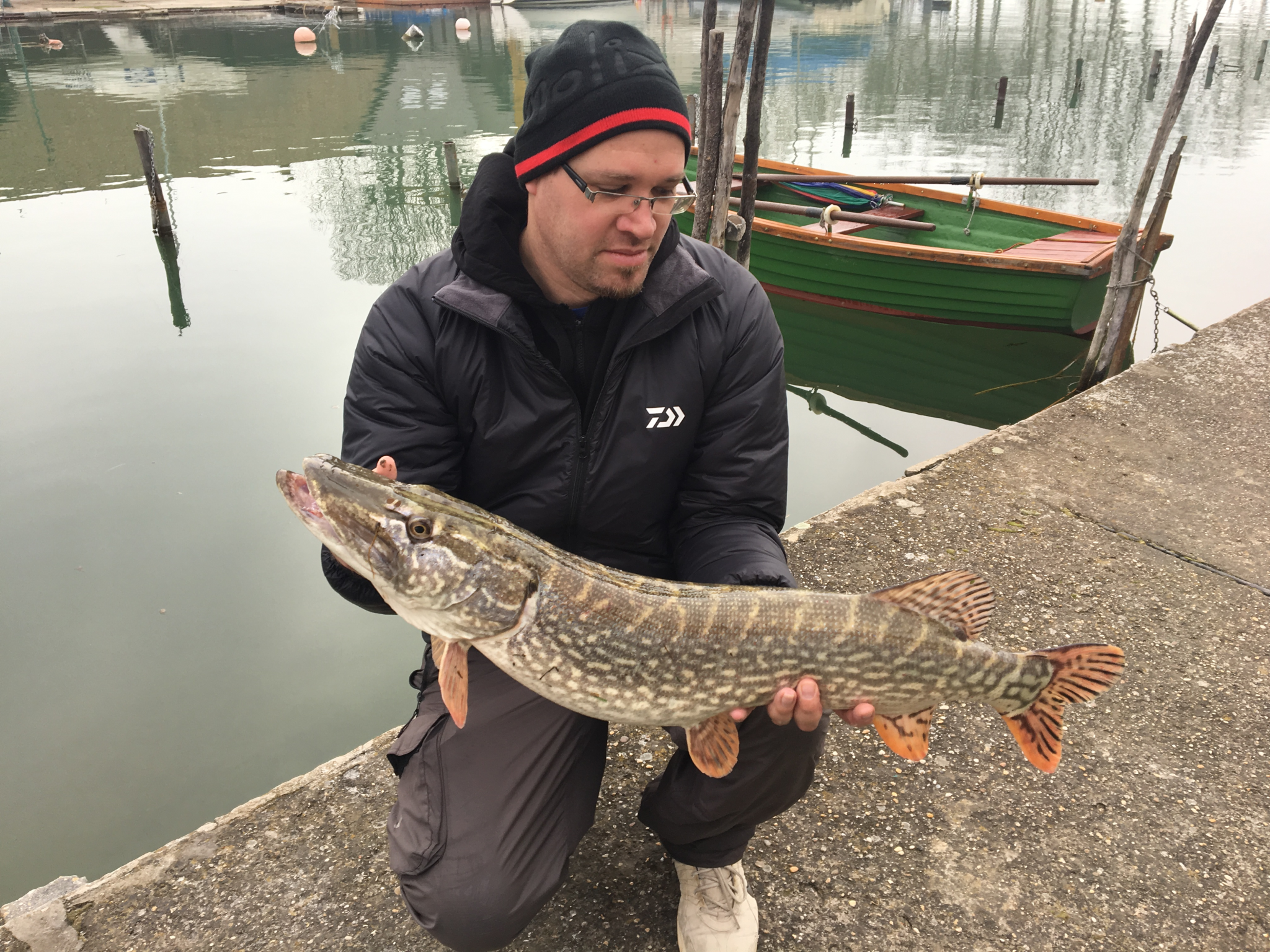 Egy héttel később, ugyanarról a stégről, szintén DAM kanálra jött ez gyönyörű csuka. Egy elnehezedéssel jelentkezett, a stéglábak és a szák hiánya miatt nehéz volt a fárasztása, de végül segítséggel sikerült kivenni egy mérés, és fotó erejéig.