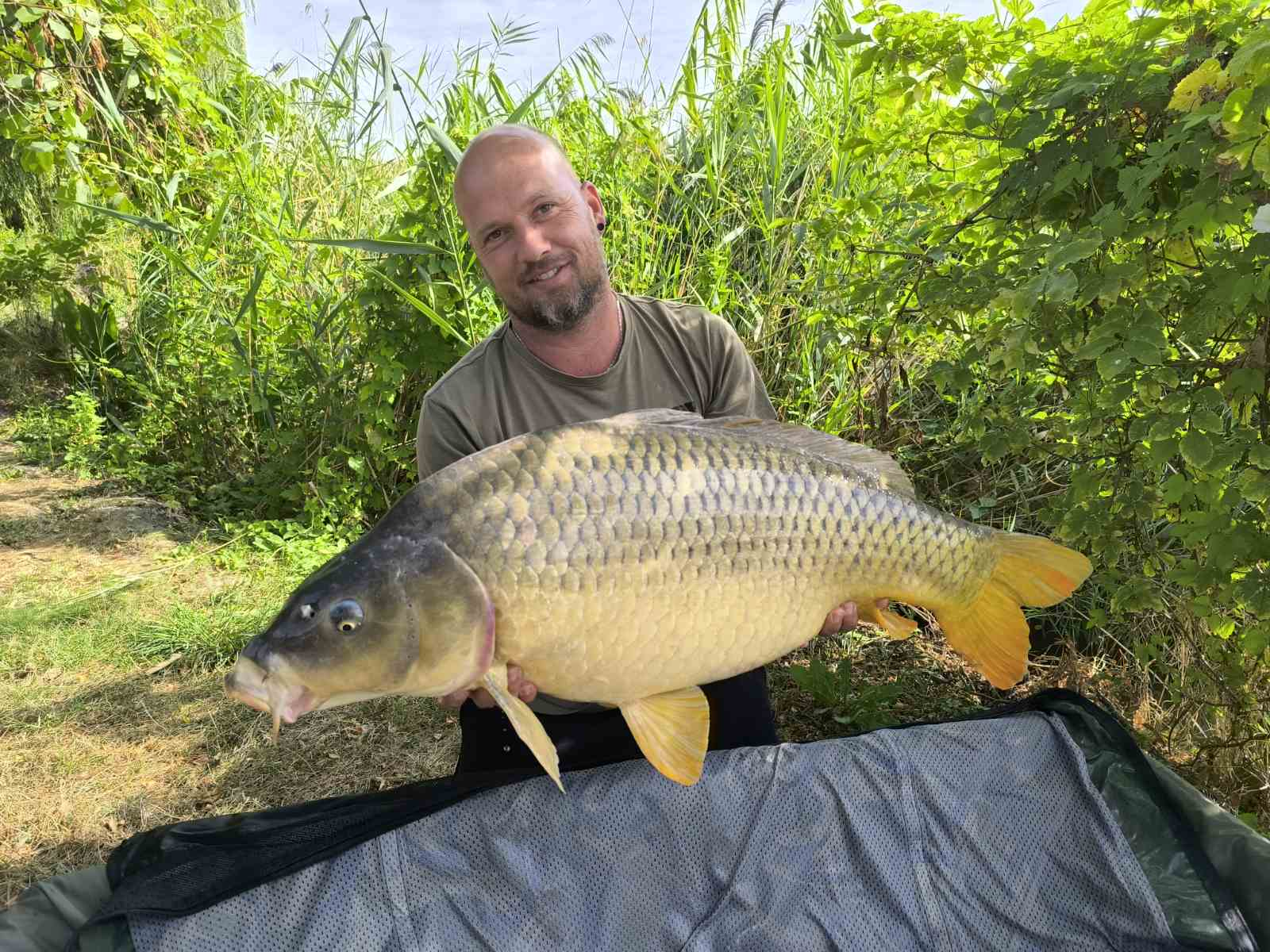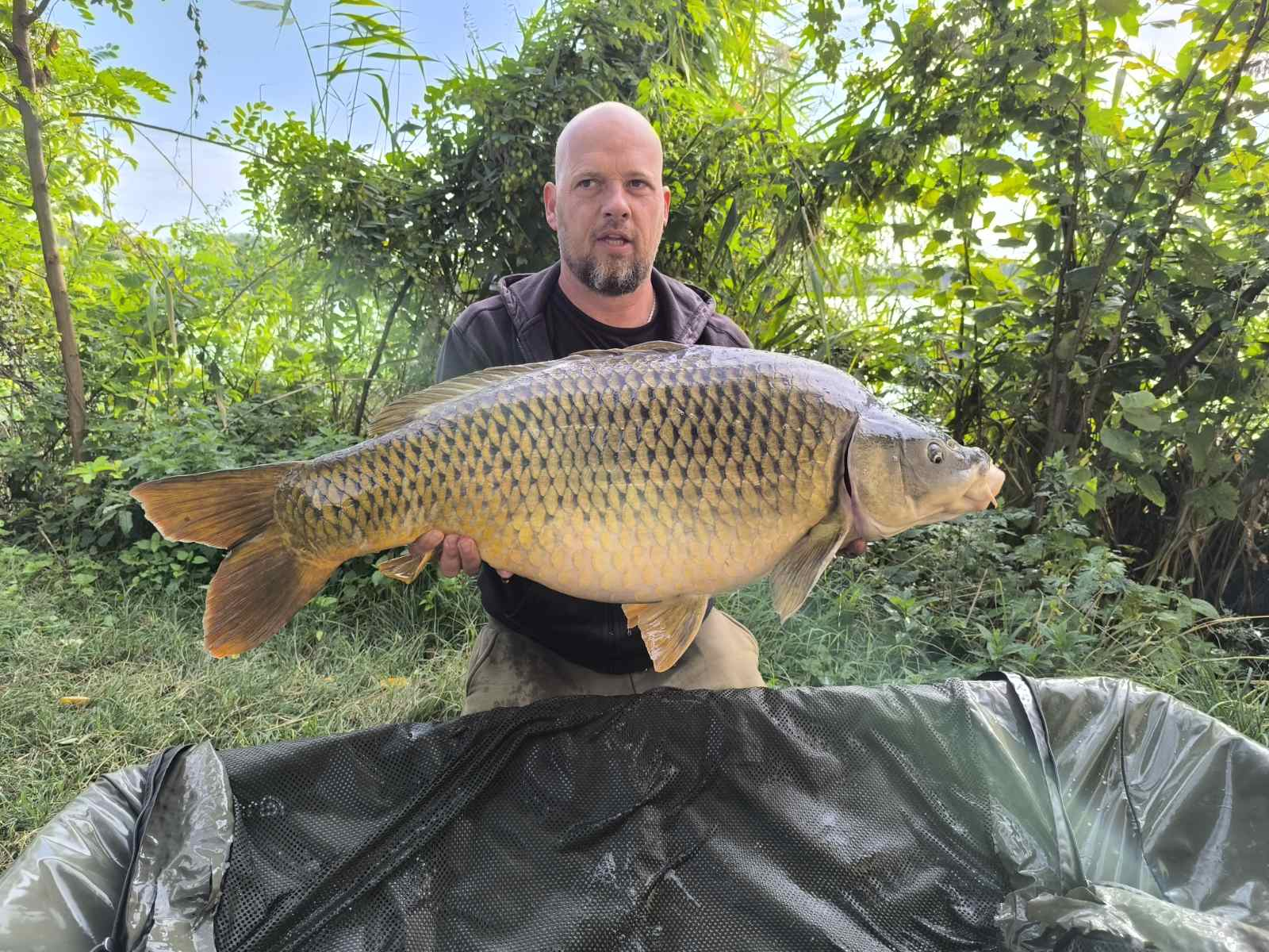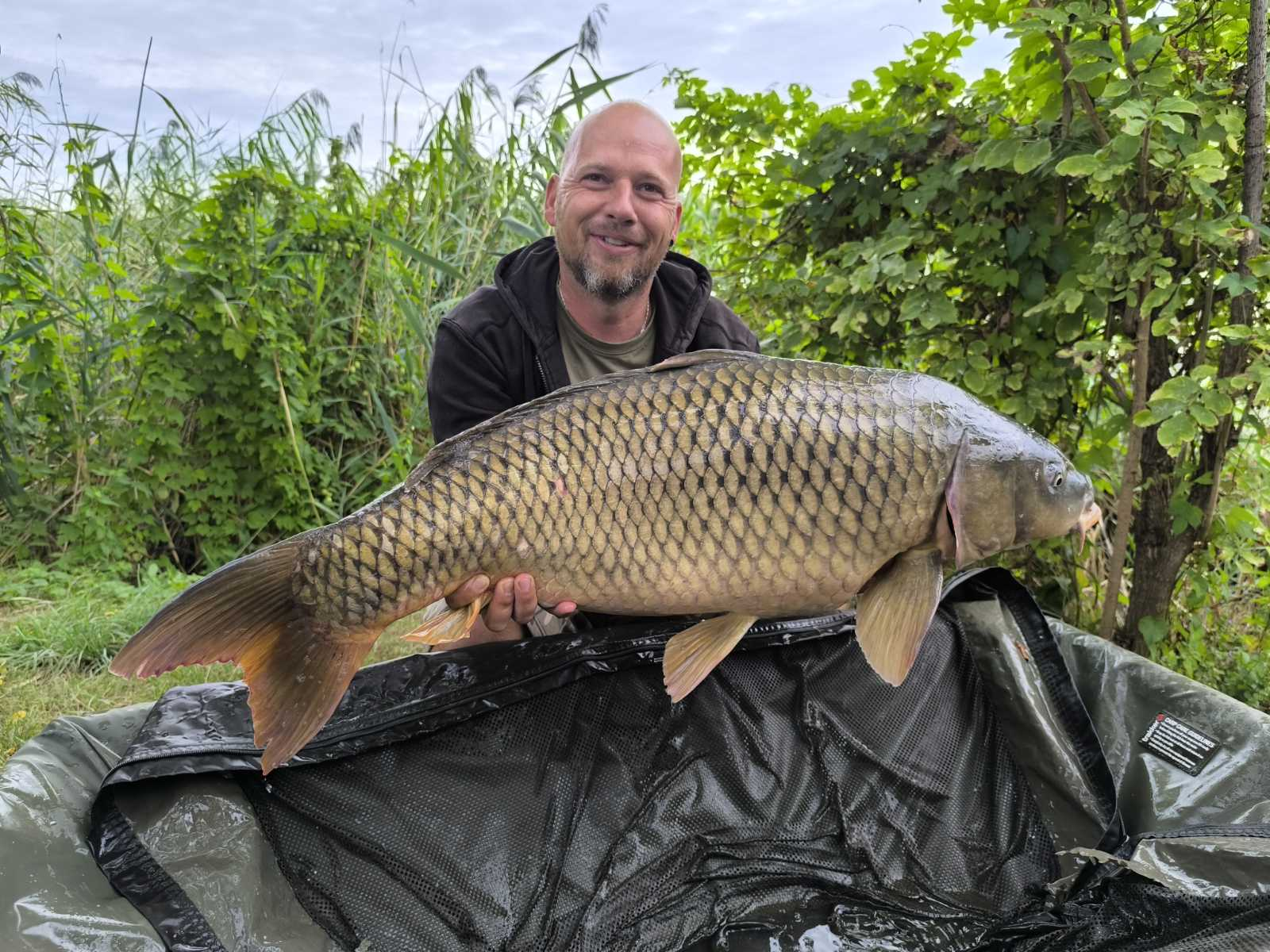 3 m-es 2,5 lbs bot, 0,35-ös monofil zsinór, 1-es horog. Bojli csali és etetés. Meleg idő, szélcsend, 15 perces fárasztás partról.