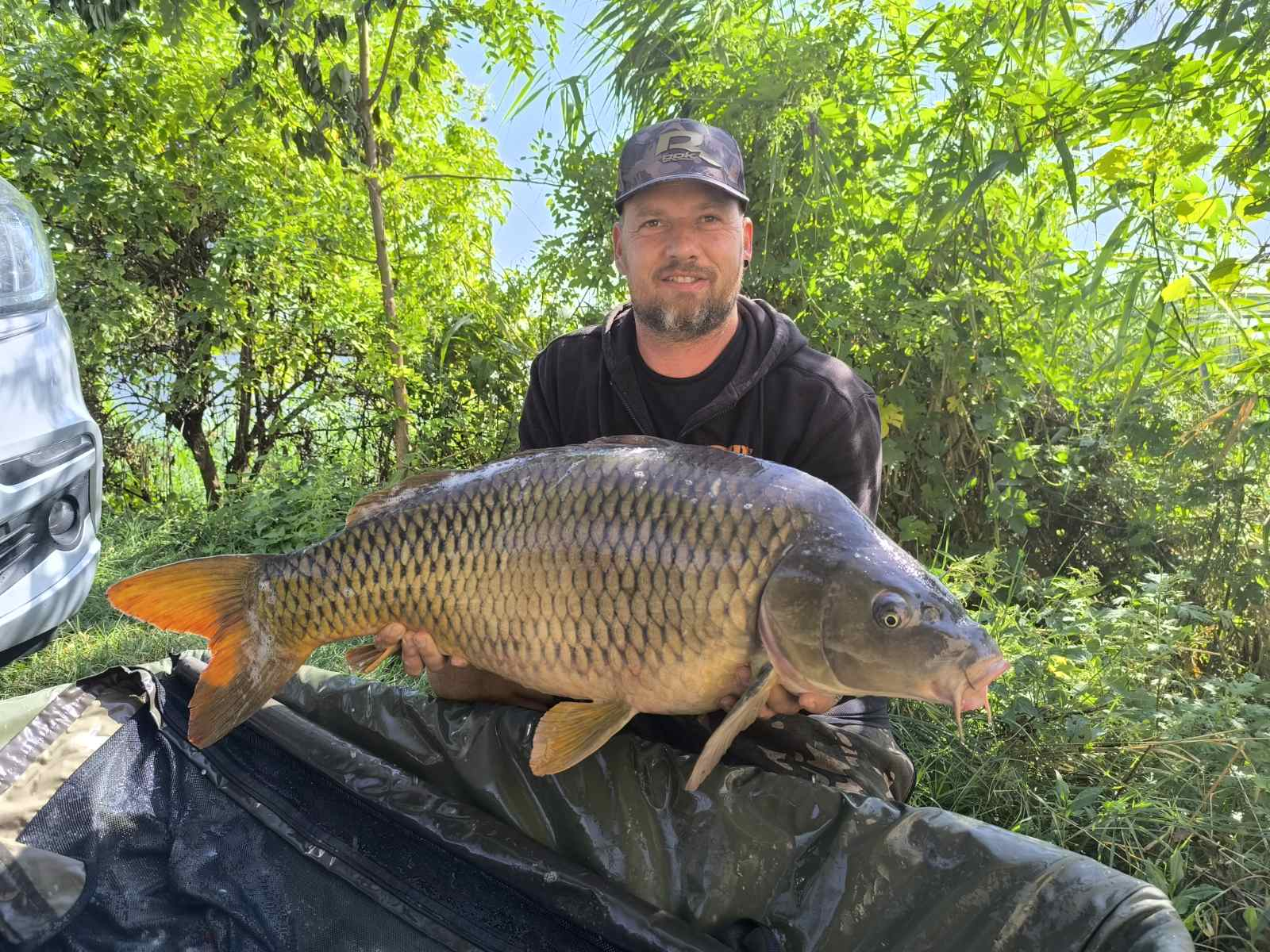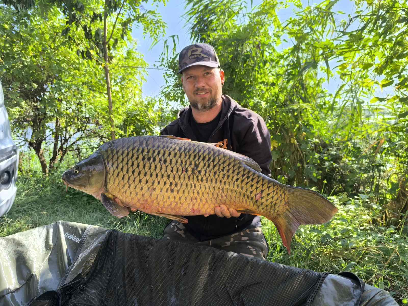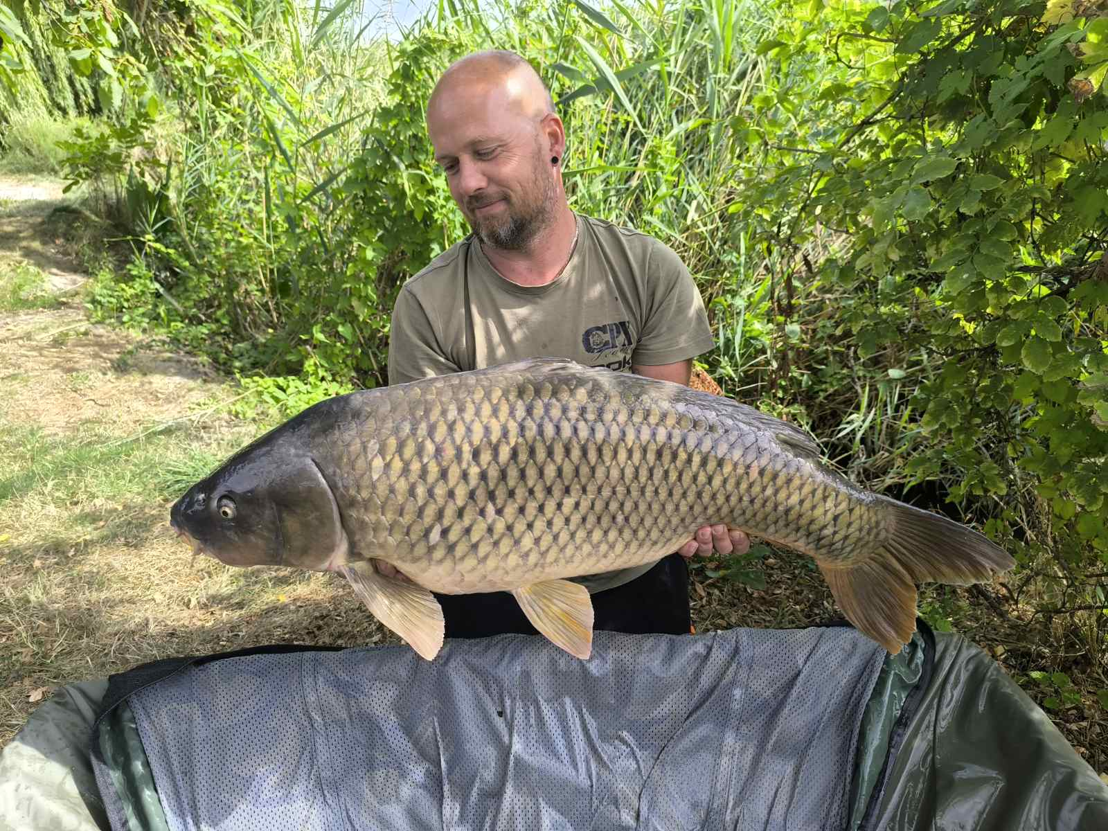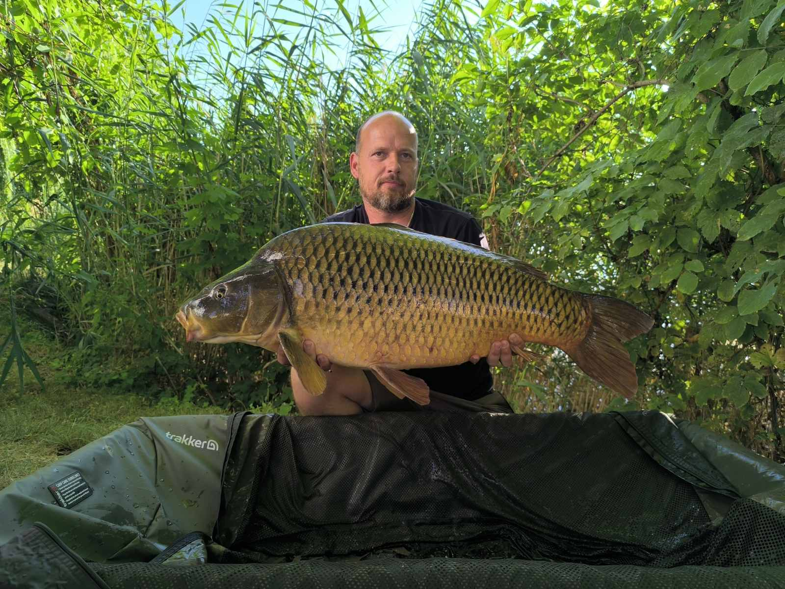 3 m-es 2,5 lbs bot, 0,35-ös monofil zsinór, 1-es horog. Bojli csali és etetés. Meleg idő, szélcsend, 15 perces fárasztás partról.