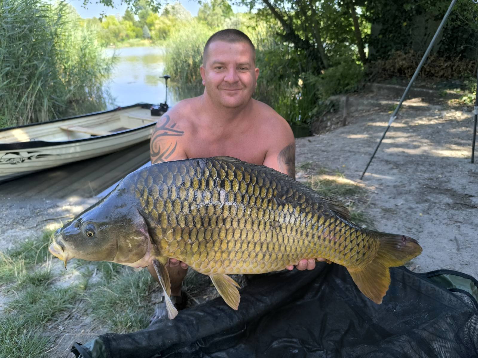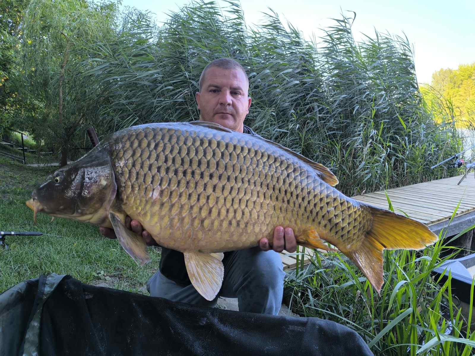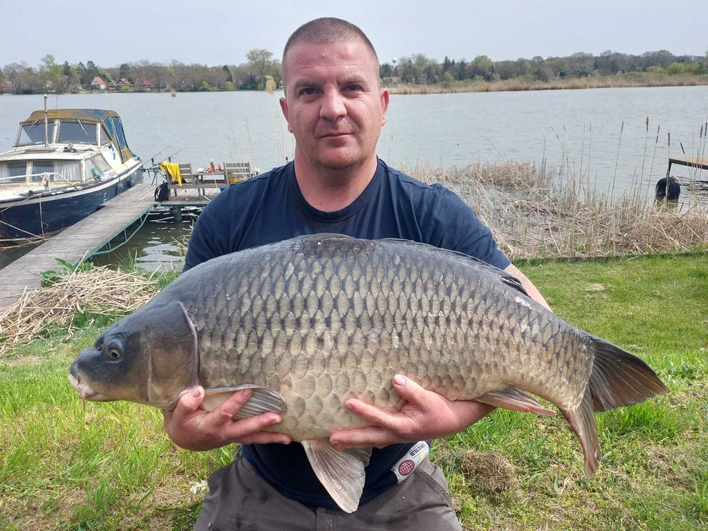 3,6 m-es 3,0 lbs bot, 0,30-as monofil zsinór, 6-os horog. Bojli csali és etetés. Derült idő, szélcsend, 15 perces fárasztás partról.