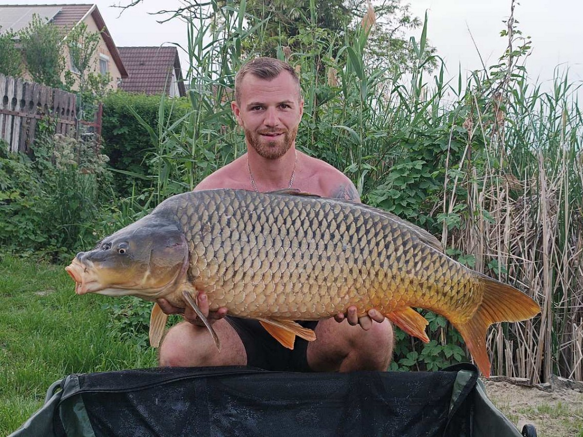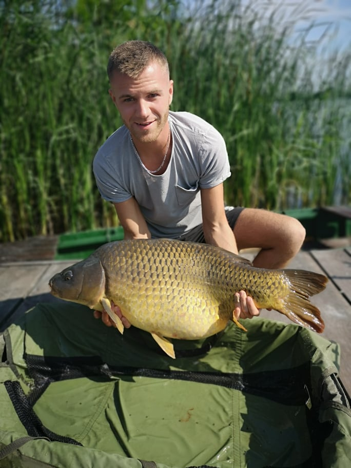 3 m-es 3,5 lbs bot, 0.28-as monofil zsinór, 4-es horog. Bojli csali, etetés bojlival és kukoricával csónakból. Napos, meleg idő, 25 perces fárasztás csónakból.