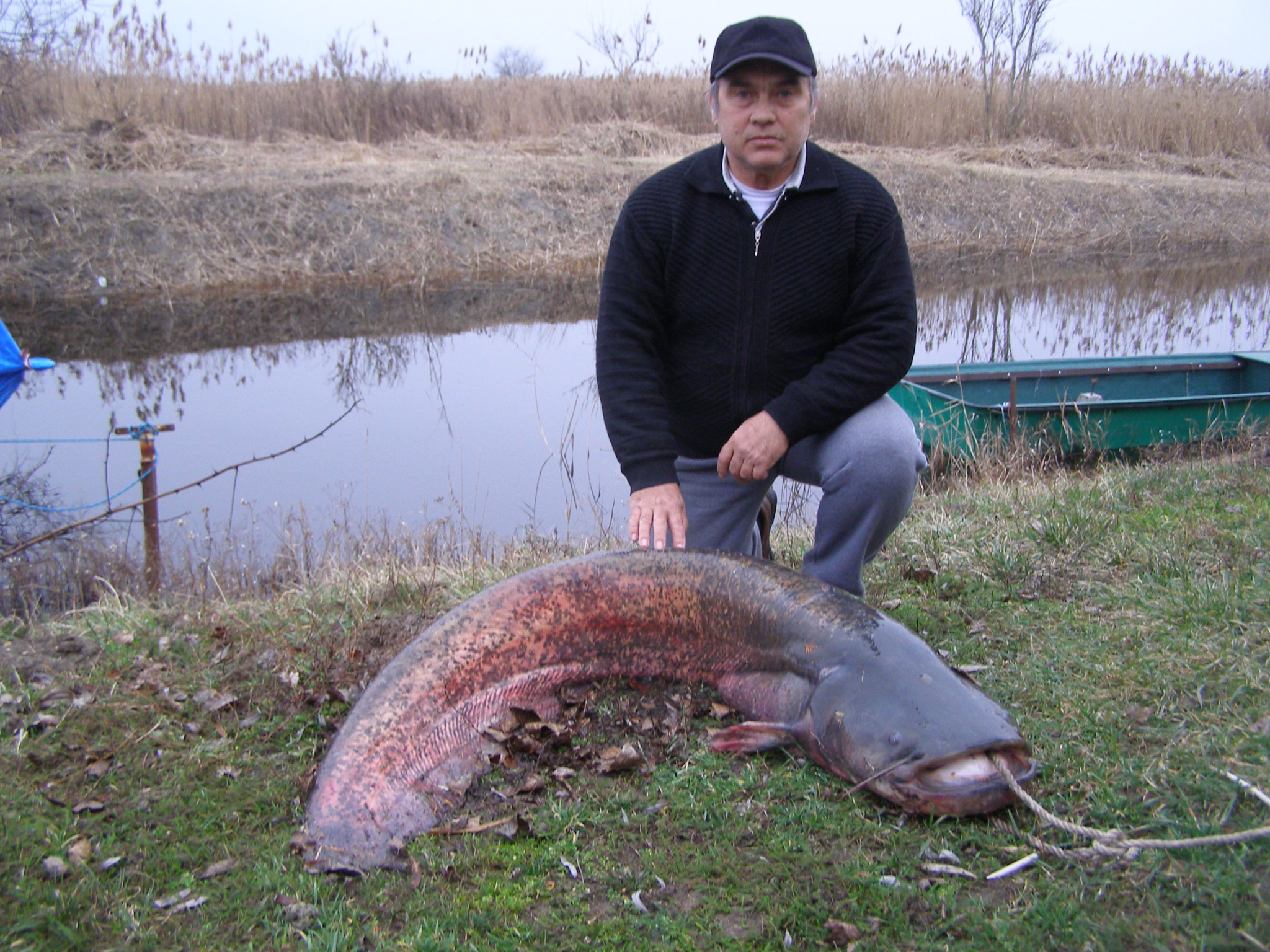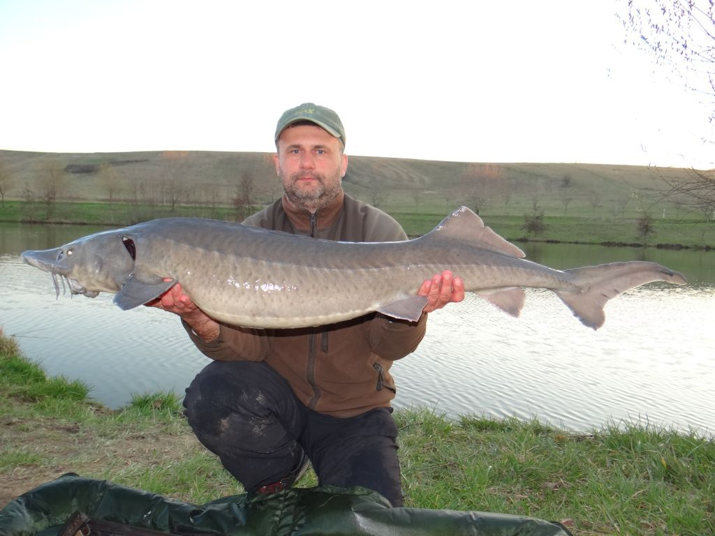 Pergetős bot, 0,12 fonott zsinór, Excalibur 40-80. Szeles időben, csónakból kb. 30 perc fárasztás után zsákot húztak rá, és úgy emelték ketten a csónakba.