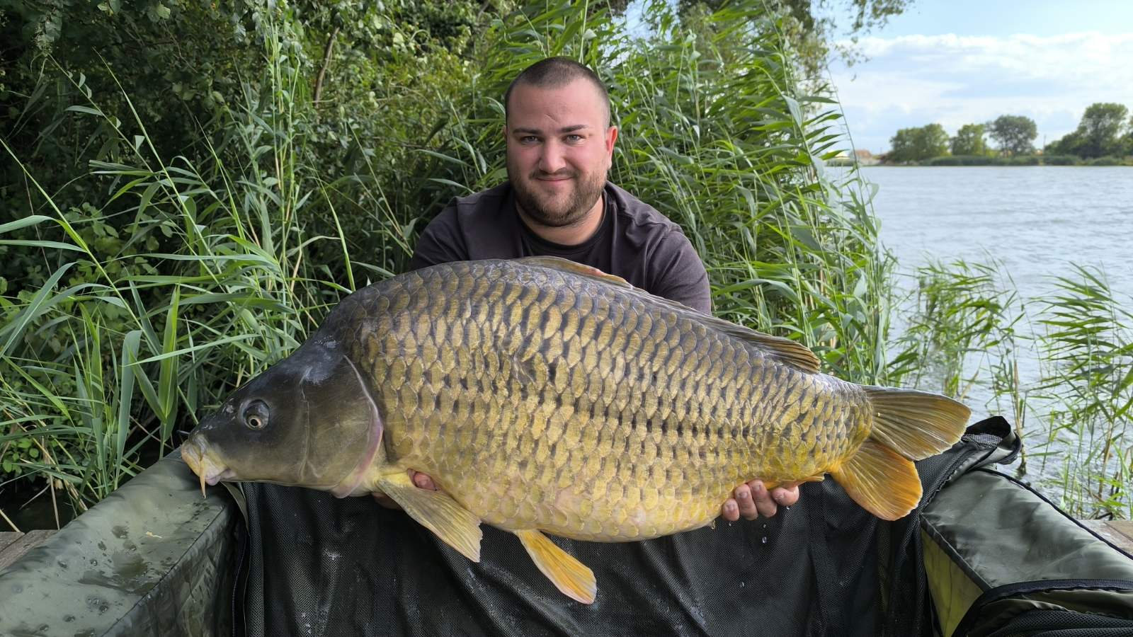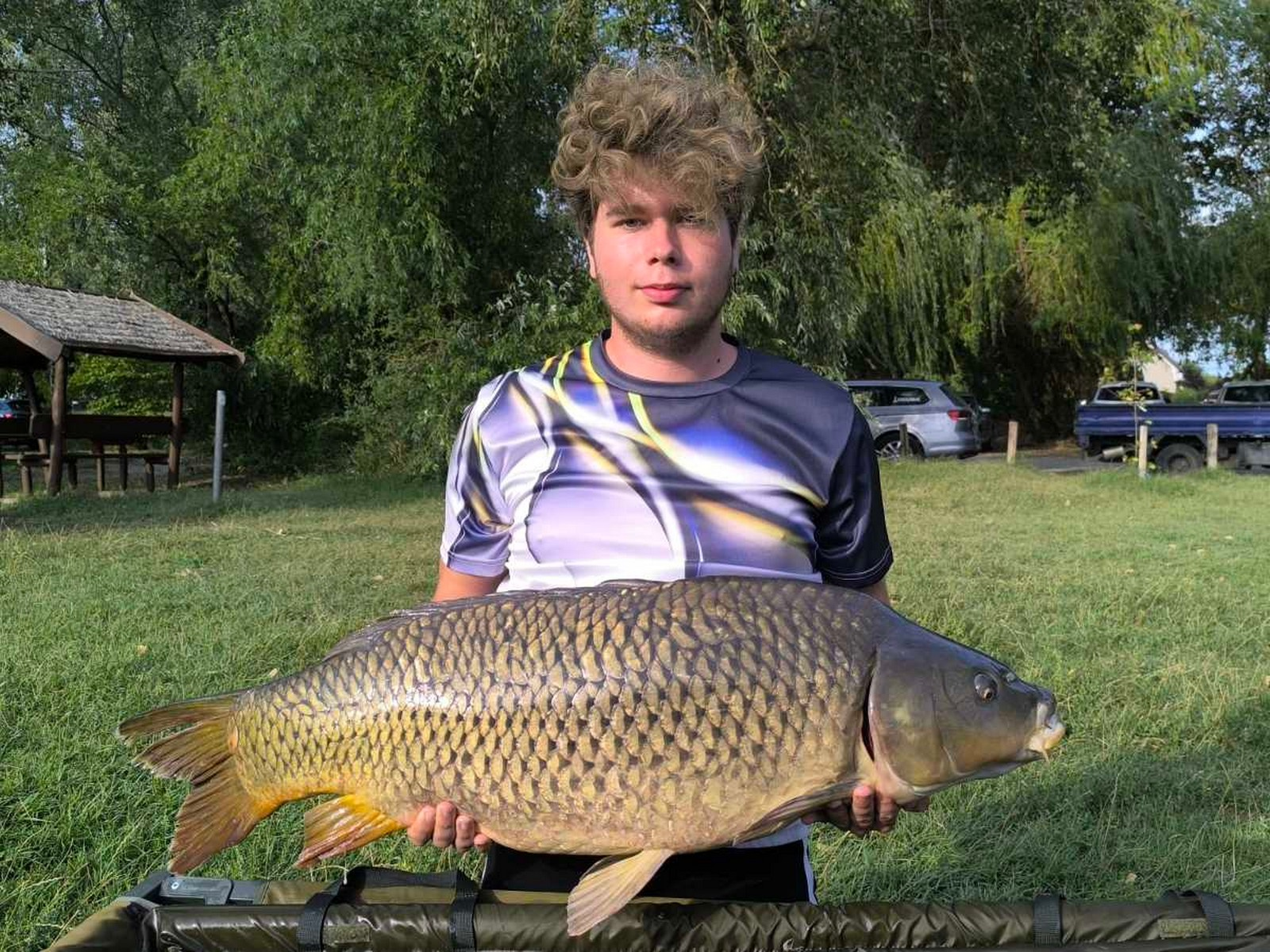 3,9 m-es 3,5 lbs bot, 0,33-as monofil zsinór, 6-os horog. Gumikukorica és gumi tigrismogyoró csali, etetés magvakkal és bojlival. Hűvös idő, gyenge szél, 15 perces fárasztás partról.
