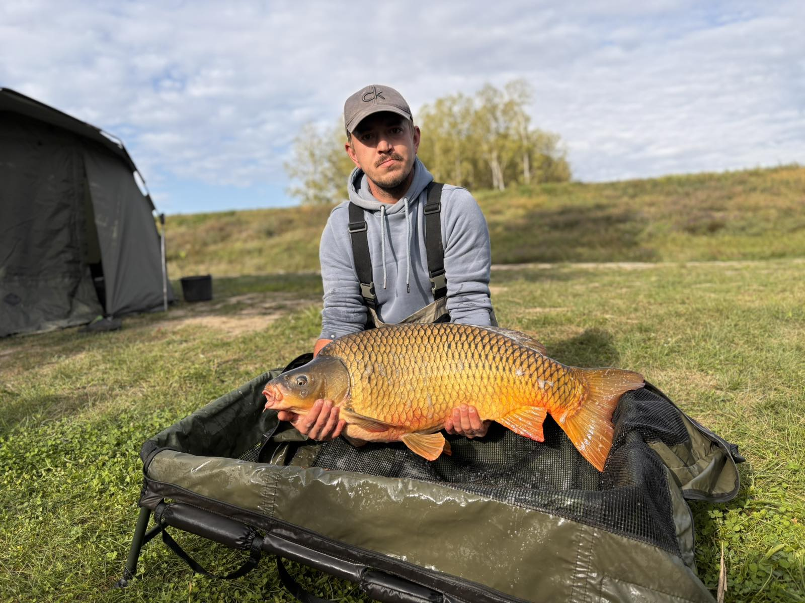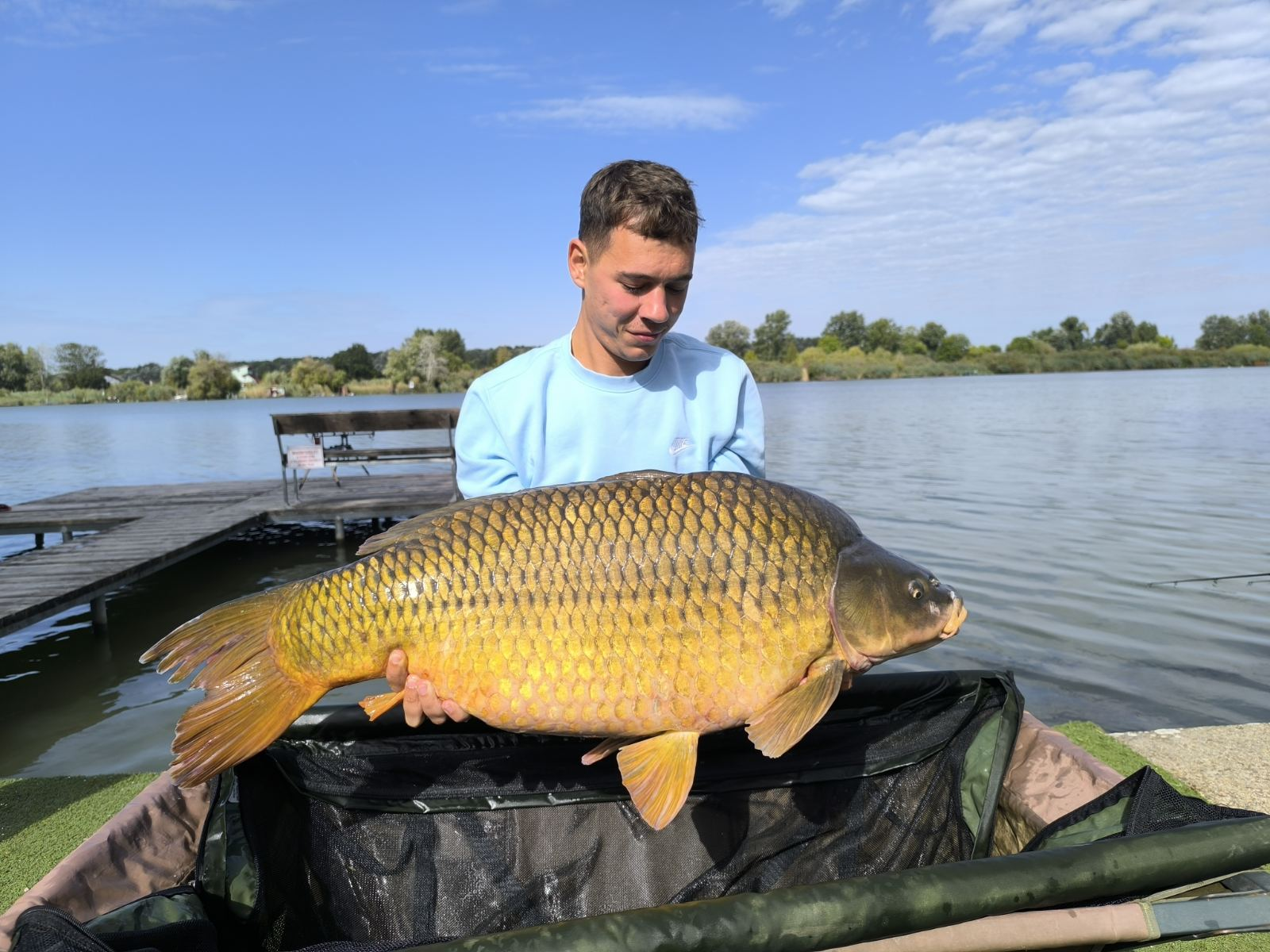 3,9 m-es 3,5 lbs bot, 0,30-as monofil zsinór, 4-es horog. Bojli csali és etetés. Hűvös idő, szélcsend, 5 perces fárasztás partról.