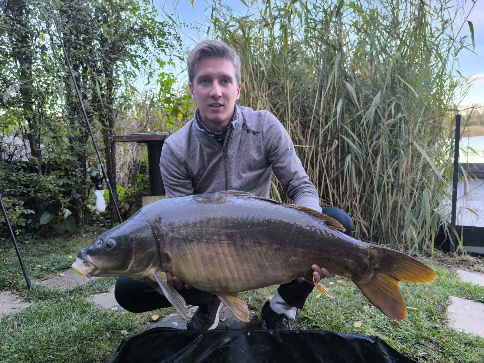 3 m-es 3,0 lbs bot, 0,38-as monofil zsinór, 2-es horog. Bojli csali és etetés. Gyenge szél, 15 perces fárasztás csónakból.