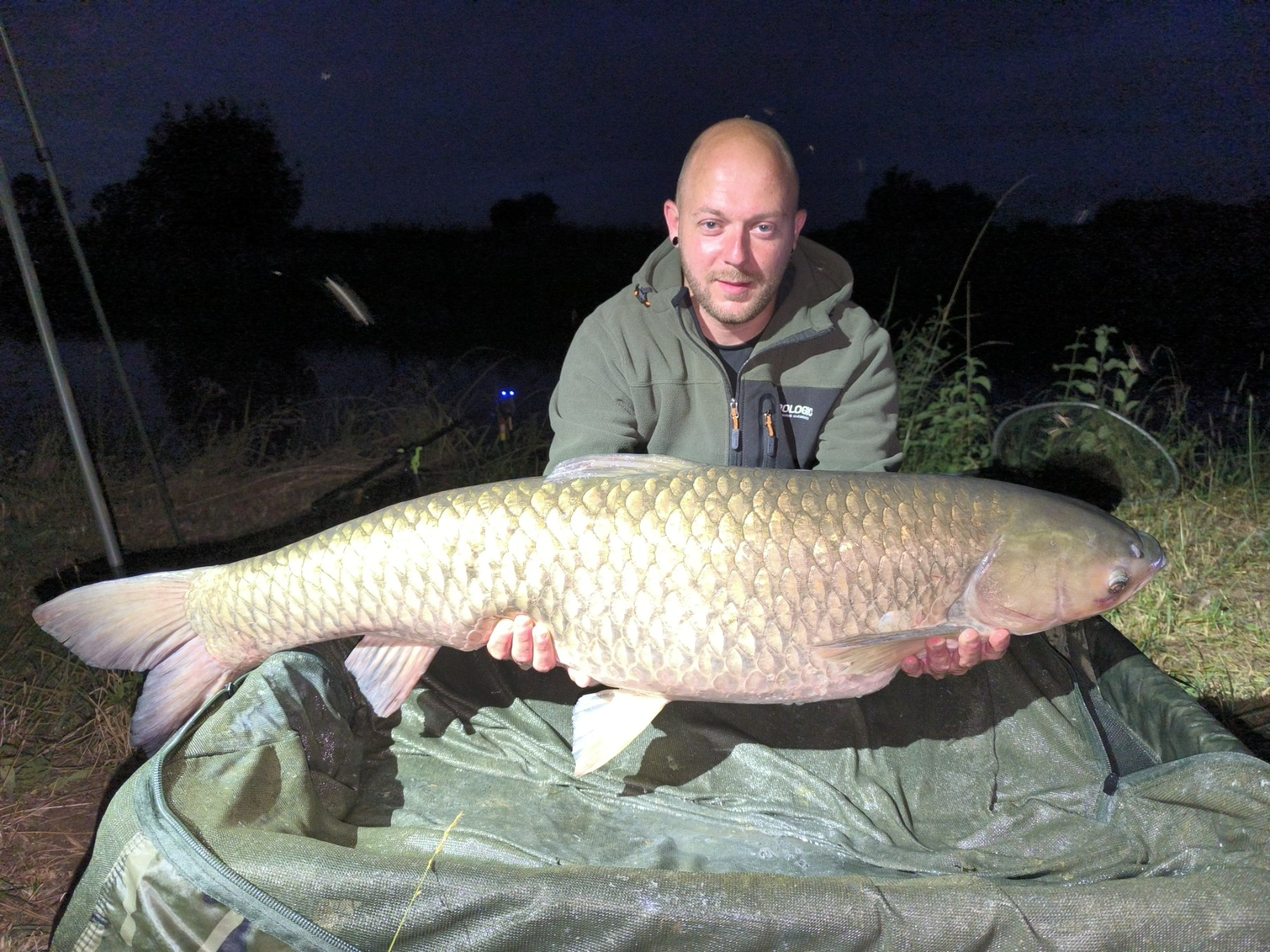 3,9 m-es 3,5 lbs bot, 0,30-as monofil zsinór, 2-es horog, tigrismogyoró csali. Napos, szeles idő, 20 perces fárasztás partról.