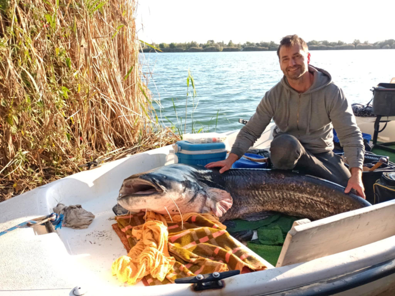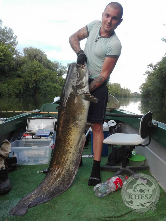 Az Őszi Fás-tavi Csónakos Harcsafogó Versenyen kuttyogató módszerrel, puhatestű csalival fogva.