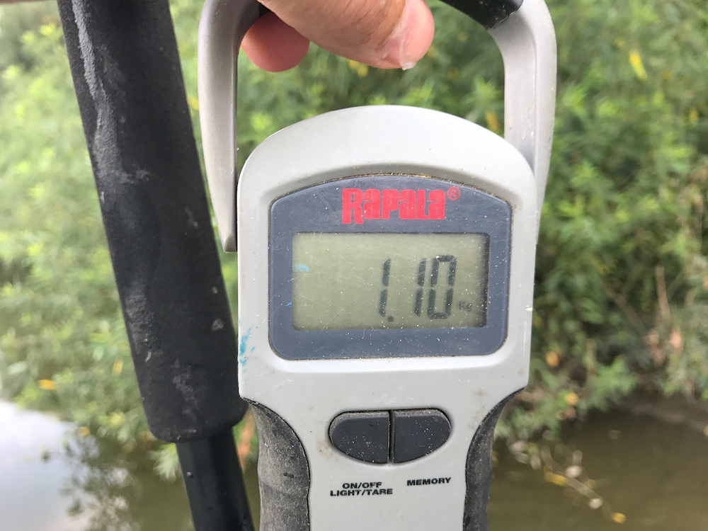A mérlegelés betárazott merítőfejben történt kizárólag magamnak, mert látszódott hogy nagy és hogy el ne felejtsem mennyi az új rekordom, gyorsan lefotóztuk. A hosszát utána a merítőfejben egy ráfektetett damil darabbal mértem le faroktőig, amit zsebre vágva utána itthon mértem le hogy mennyi is valójában (45-46 cm között). A hasi úszóinak a hossza igen tekintélyesek voltak, a mutató ujjam hegyétől egészen a hüvelyk ujjam tövéig ért (utólag mérve ez minimálisan 13 cm-t jelent). Nem akartuk sokáig kínozni, mert ezek pikkelyei nagyon könnyedén lejönnek, így amikor megugrott a kezemben, hogy ne törje össze magát a hal a csónakban inkább a víz felé toltam, így azonnal el is úszott olyan sebesen ahogy jött.